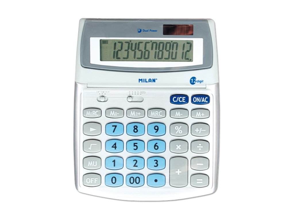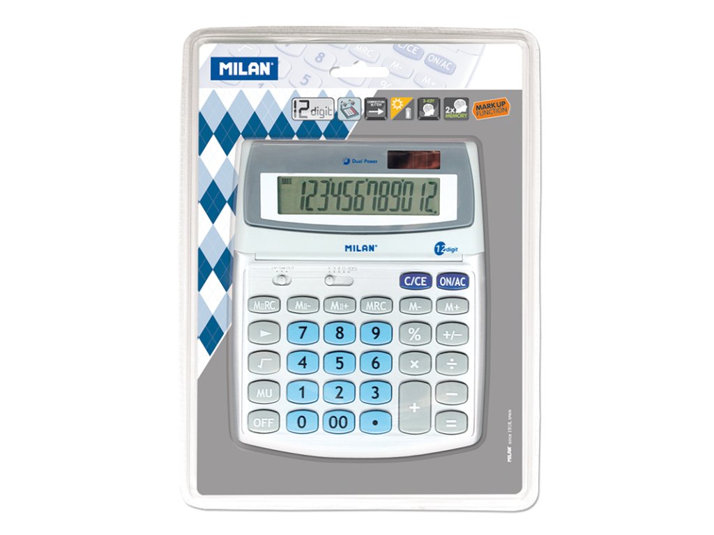 Stolová 12-místná kalkulačka MILAN s nastavitelným úhlem pohledu. Kalkulačka má velké plastové tlačítka, která jsou navíc barevně rozlišeny. Výhodou je duální napájení: 1,5 V baterie + solární panel. Kalkulačka má rozšířené funkce jako výpočet%, opravné tlačítko, paměť se třemi tlačítky, změnu zaokrúhľlovania.Doplňkové parametry
