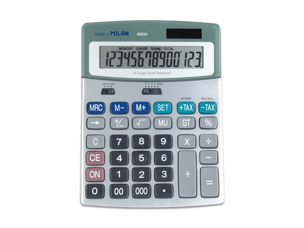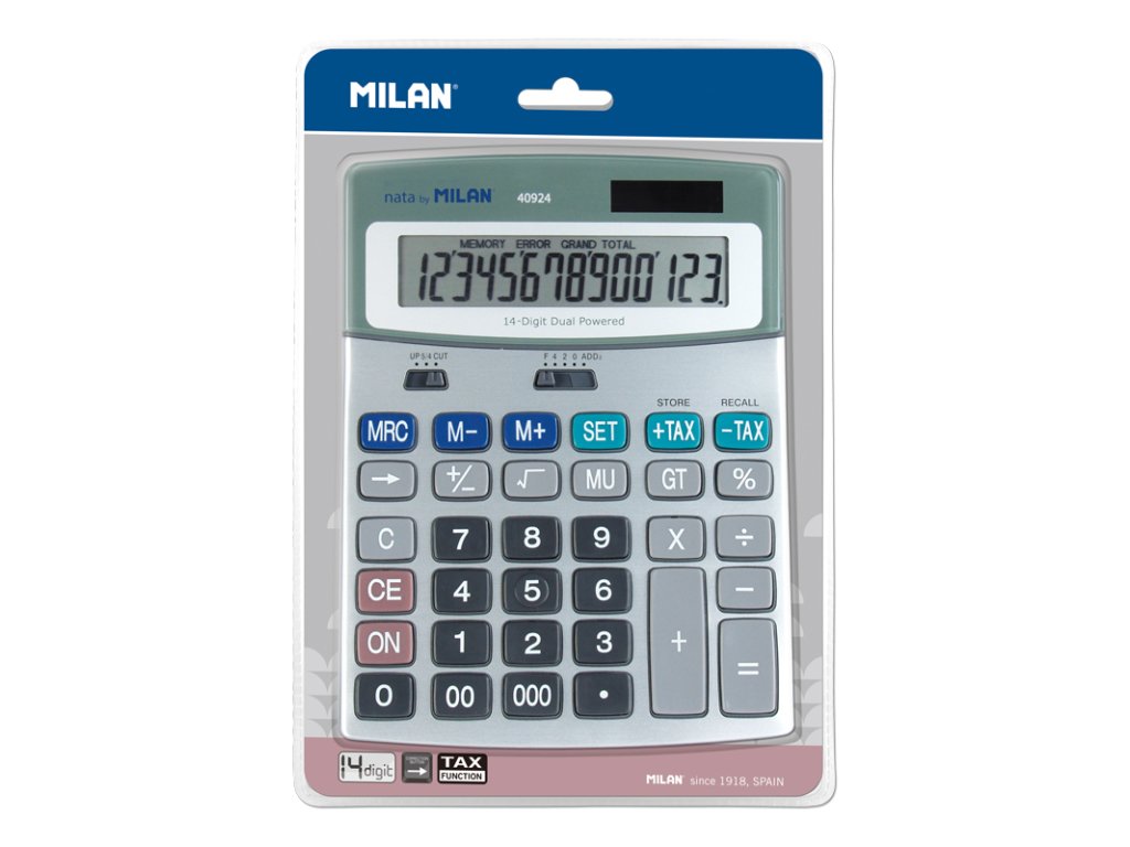 Stolová 14-místná kalkulačka MILAN. Kalkulačka má plastové tlačítka, která jsou navíc barevně rozlišeny. Vrchní část kalkulačky je zhotovena z Odolena kovu. Výhodou je duální napájení: 1,5 V baterie + solární panel. Kalkulačka má kumulativní paměť výsledků operací, výpočet procent, změnu zaokrouhlování, daňové tlačítko. Kovové provedení.Doplňkové parametry
