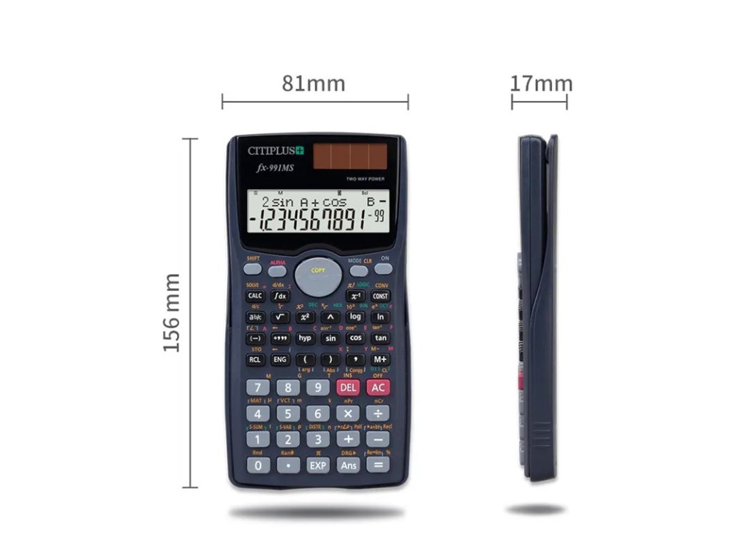Kalkulačka s 2řádkovým displejem 10+2 číslice - 401 integrovaných funkcí. - logické operace, frakce, kombinace a permutace, statistiky, regrese, konverze Napájení: solární panel + baterie LR44 s dlouhou životnostíDoplňkové parametry
