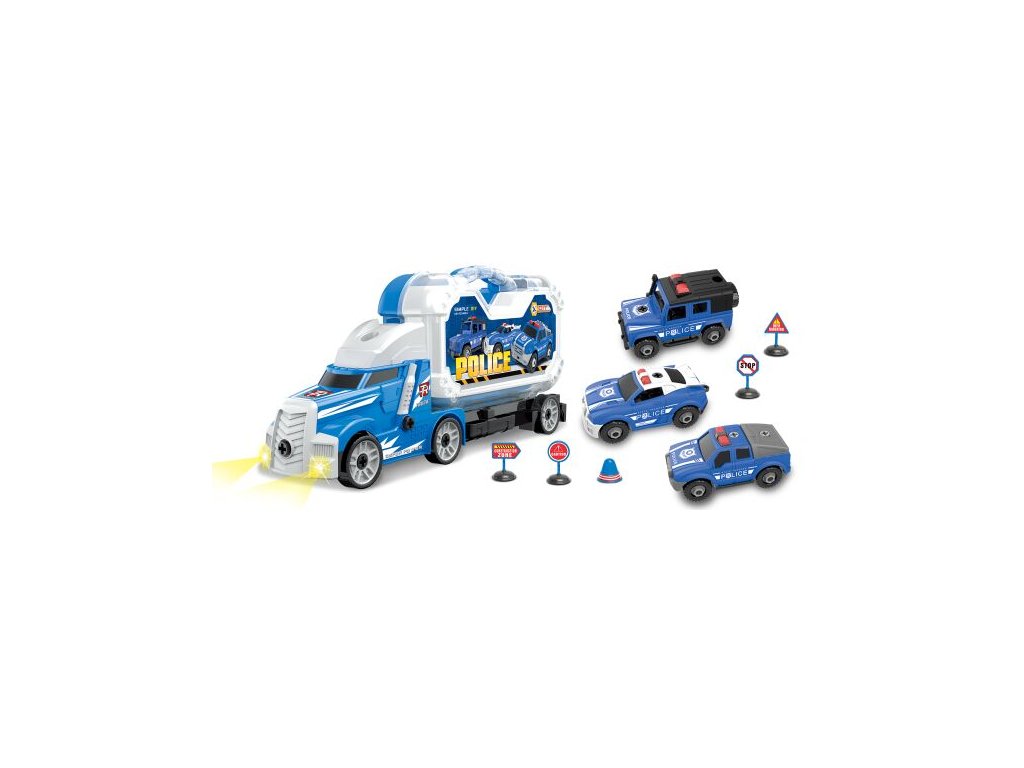Kamion policejní s 3 auty šroubovací s efekty. Rozměry 42x20x9 cm. Světelné a zvukové efekty. 3xAG13 baterie součástí. Volná kola. Obsahuje kamion, kufřík, 3 auta, šroubovák, 5 značek. ON/OFF přepínač na spodní straně kamionu.Doplňkové parametry