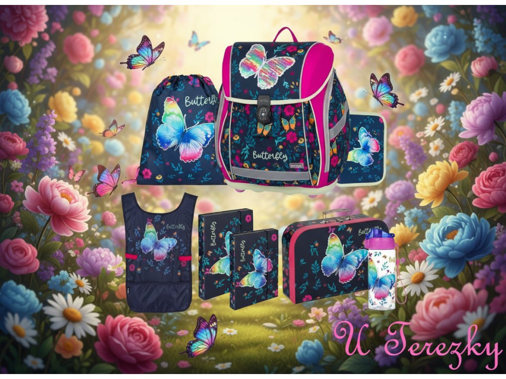 Školní set pro prvňáčka s motivem motýla. Velký set obsahuje školní batoh Premium, penál, sáček, zástěrka, kufřík, láhev na pití, desky na sešity A4, A5, vhodný i pro prvňáčka