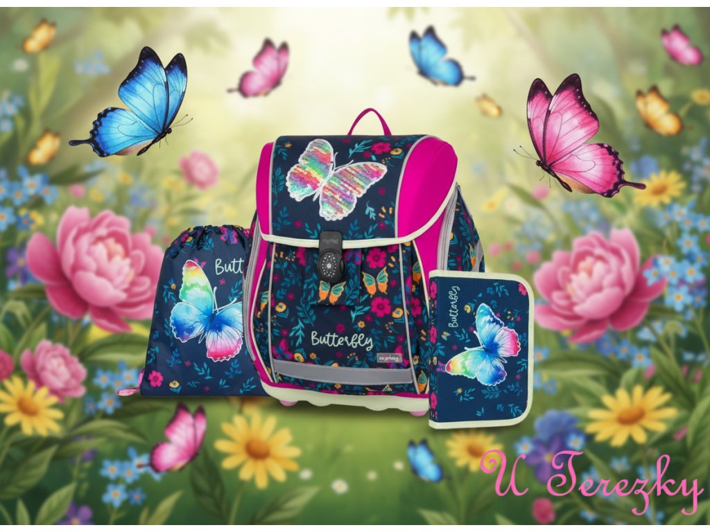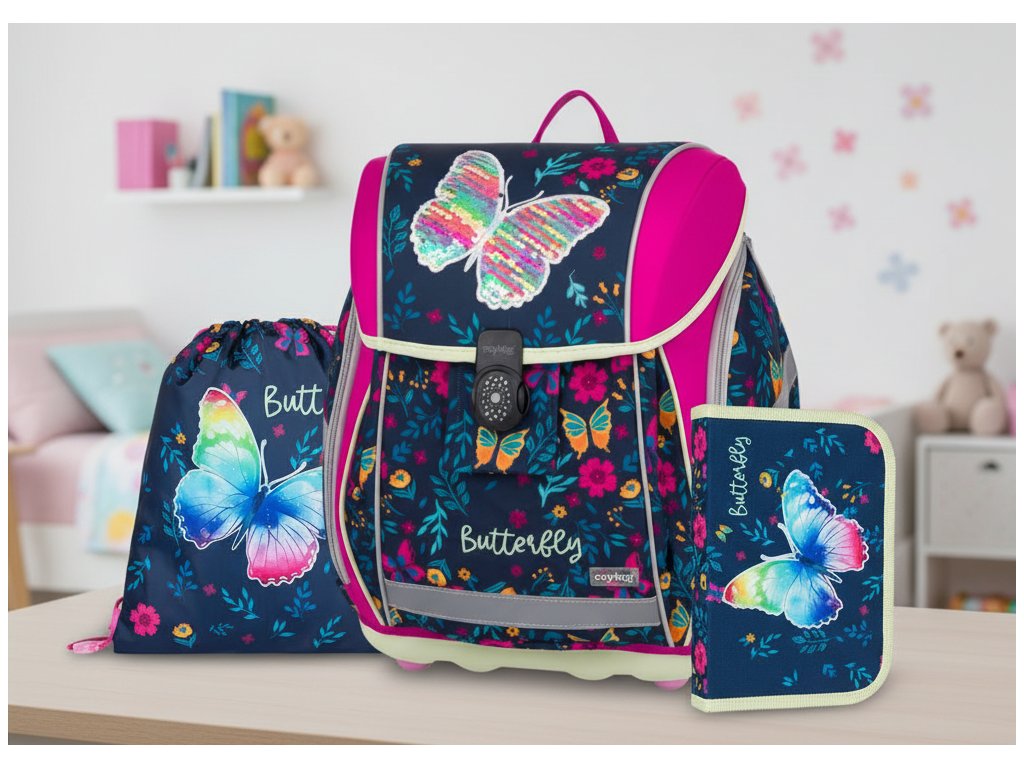 Karton P+P Oxybag Školní set sada 3ks PREMIUM LIGHT Motýl 2 batoh, penál, sáček vhodný i pro prvňáčka 0-85225