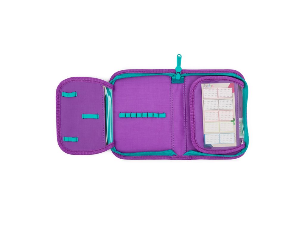 Jednopatrový školní penál s 2 chlopněmi, prázdný obsahuje 25 gumových poutek pro uchycení psacích potřeb. Na vnitřních chlopních jsou průhledné fólie pro rozvrh hodin.