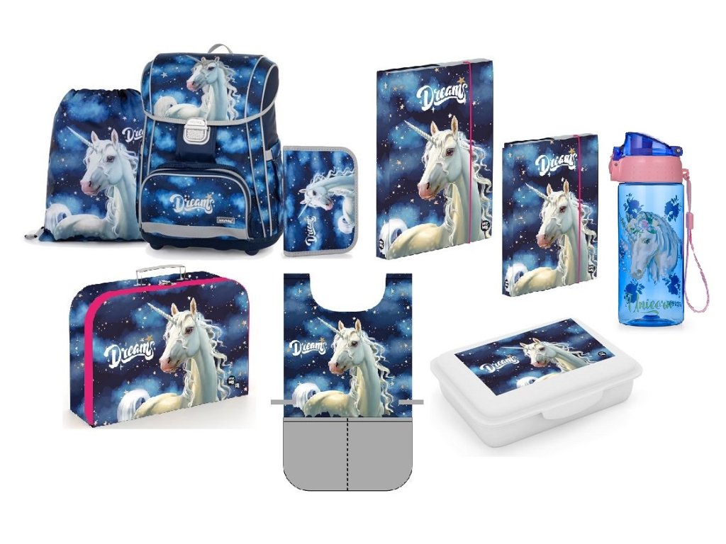 Karton P+P Školní sada set 9-dílný PREMIUM Unicorn Jednorožec Kůň 0-20724/09 batoh vhodný pro prvňáčky - obsahuje batoh, penál, sáček, zástěrka, kufřík, boxy na sešity A4 a A5, box na svačinu, láhev
