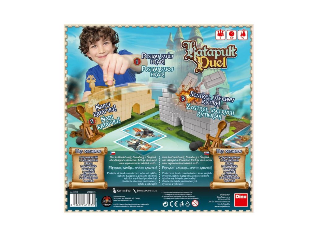 Souboj katapultů právě začíná! Postavte své hrady pevně a rozmístěte obranné jednotky chytře. Hrajte takticky s kartami nebo prostě jen střílejte. Vítězem se stane ten, kdo protihráči shodí poslední figurku. Hra od 7 let pro 2 hráče.Doplňkové parametry