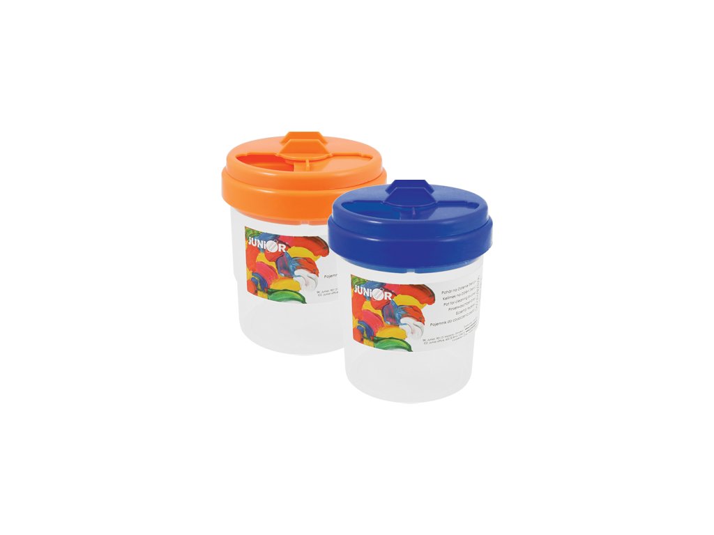 Kelímek na čištění štětců z průsvitného plastu, s barevným víčkem, s otočným bezpečnostním uzávěrem. Praktický otvor ve tvaru trychtýře dobře drží štětec a zabraňuje tak nechtěnému vylití vody.Doplňkové parametry