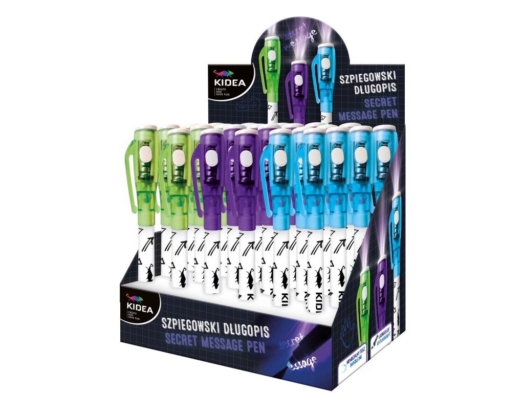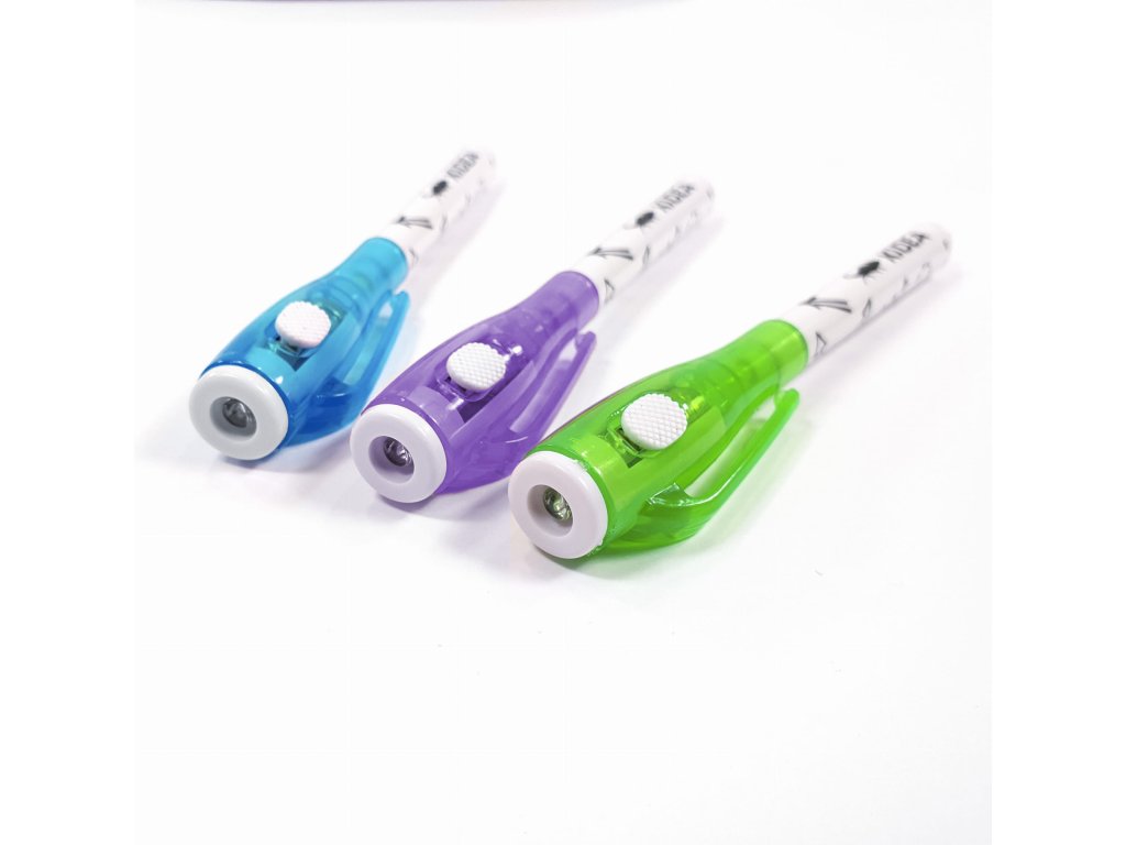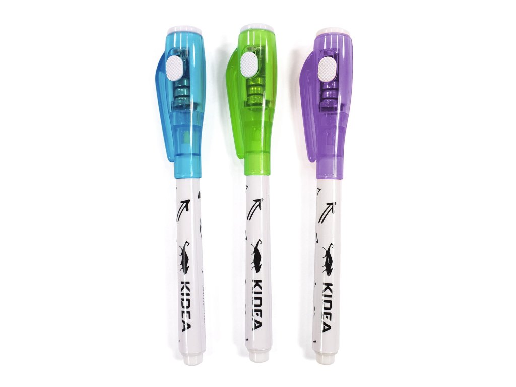 Toto kouzelné pero s LED světlem má inkoust viditelný pouze pod světlem vestavěné UV svítilny. Inkoust je při psaní neviditelný; chcete-li si neviditelnou zprávu přečíst, zvýrazněte stránku. Je to skvělý způsob, jak skrýt informace před zvědavými zraky a perfektní způsob, jak uchovat svá tajemství v bezpečí. Napájení z baterie. Dostupné 3 barvy: zelená, fialová nebo modrá - požadovanou barvu uveďte, prosím, do poznámky, jinak zasíláme dle aktuálních skladových zásob nebo náhodného výběru. Pero je bezpečné pro děti - certifikováno, použití je snadné, rozměry: 13 x 1,5 cm. Výrobek se prodává samostatně bez obalu, zasíláme v sáčku, cena za jeden kus pera, je vhodné jako dárek pro kluky i holky od 3 let.Doplňkové parametry