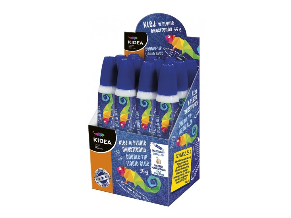Oboustranné tekuté lepidlo 35g. Tekuté lepidlo zaručuje trvalé spojení povrchů. Má dva různé hroty: úzký pro přesné nanášení lepidla a širší, ideální pro nanášení lepidla na velké povrchy. Lepidlo rychle schne. Po zaschnutí je dokonale průhledné, což je velmi důležité při provádění uměleckých děl. Výhody: oboustranné, pohodlné pro aplikaci, snadno omyvatelné, odolné, rychlé schnutí, po zaschnutí nebarví, je transparentní a pružné. Rozměry: 14 x 9,7 x 7,2 cm, vhodné pro děti od 3 let.Víš, že…?