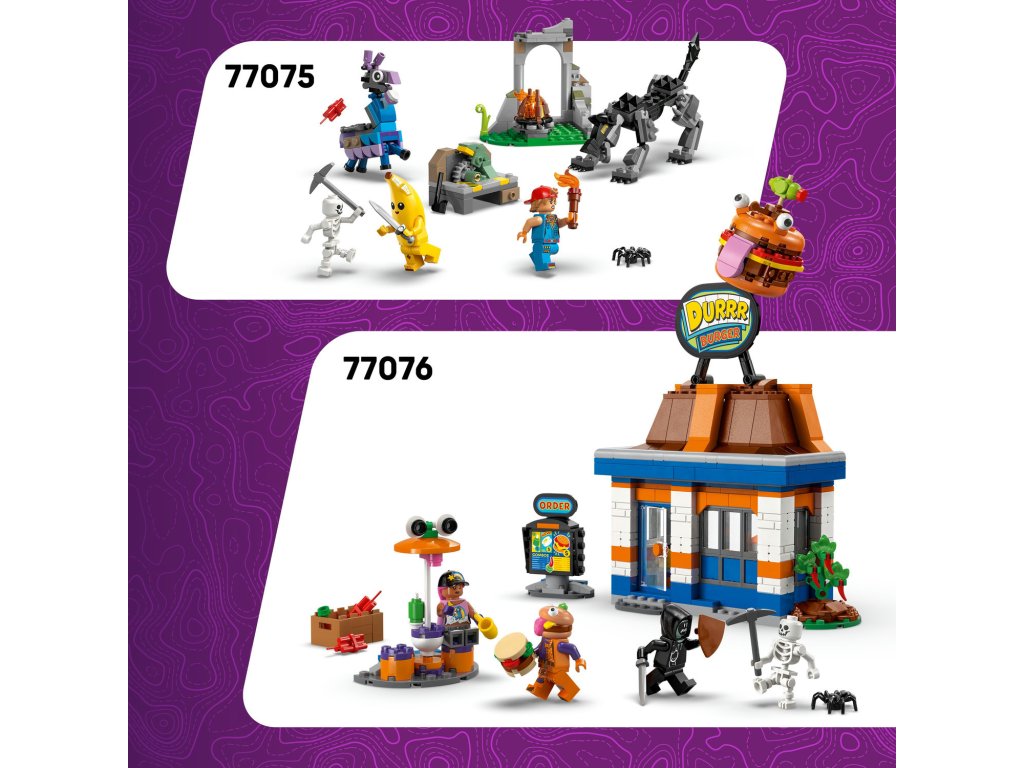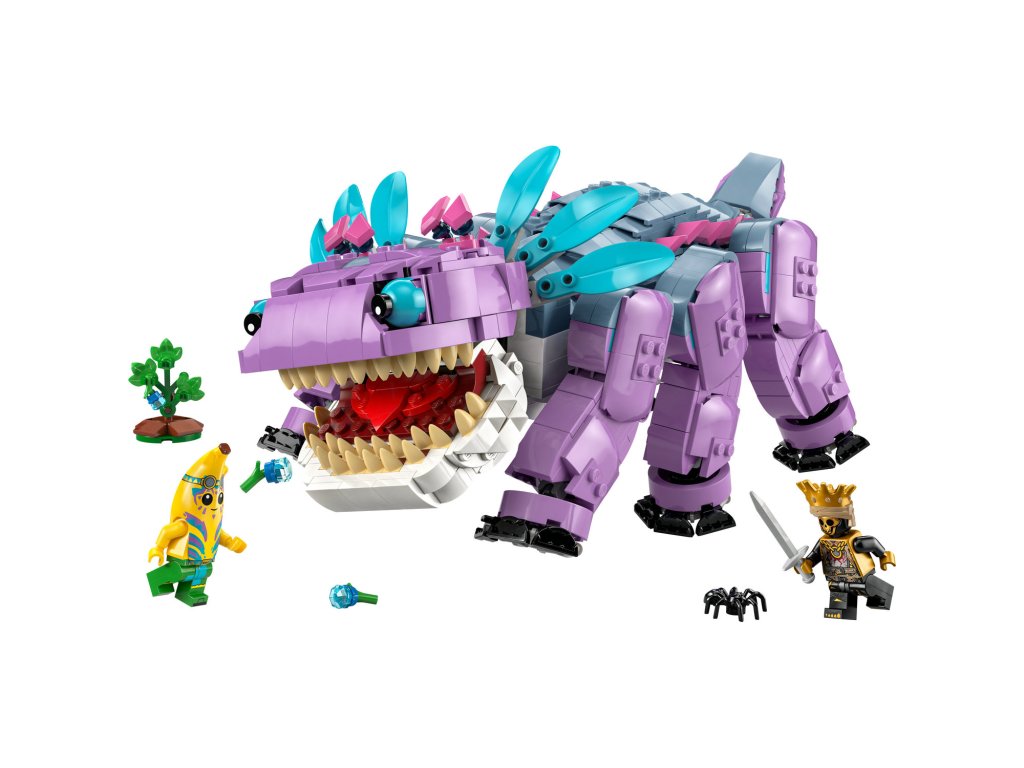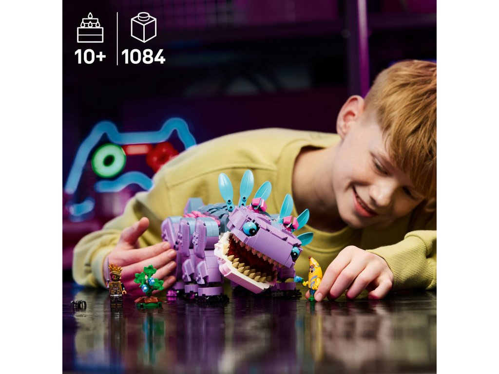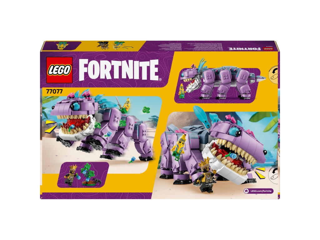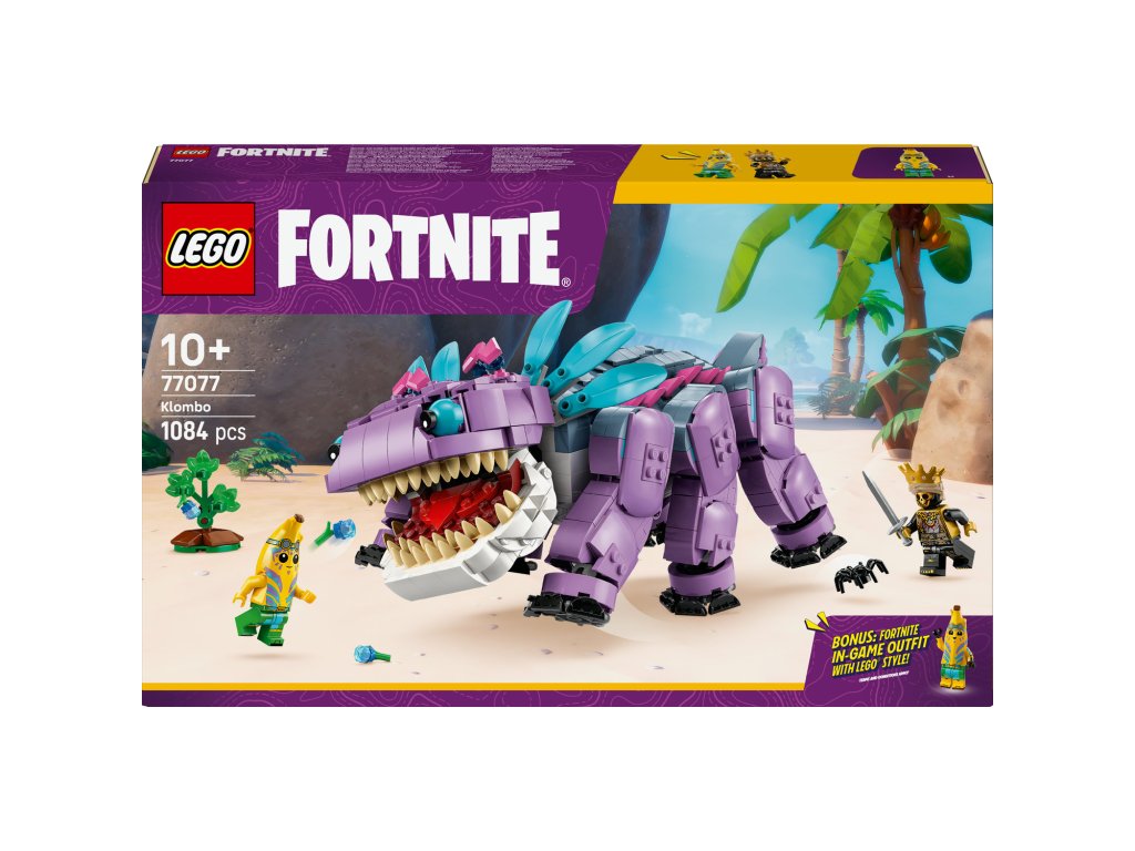 Fanoušci a gameři od 10 let si se stavebnicí LEGO® Fortnite® (77077) Klombo postaví kultovní postavu LEGO® Fortnite. Klombo je velké stvoření z videohry LEGO Fortnite a díky této stavebnici si ho holky a kluci můžou postavit z kostek LEGO. Děti siužijí spoustu zábavy při stavění modelu podle videohry Fortnite a objeví všechny jeho skvělé detaily, včetně pohyblivých nohou, otevírající tlamy a otáčejícího se ocasu. Součástí stavebnice je také malý keř Klomberry s odnímatelným ovocem Klomberries. Děti si tak můžou hrát na to, že Klomba vyruší, aby se naštval, a pak ho nakrmí ovocem, aby si Klomba udobřily. Stavebnice obsahuje také minifigurky Island Adventure Peelyho a Ora, které lze připevnit na záda Klomba a užít si s nimi tvořivé hraní na postavy. Tato úžasná stavebnice zvířátka poslouží jako krásný dárek pro gamery všech věkových kategorií a obsahuje skvělý digitální bonusový předmět. Hráči naskenují QR kód v návodu ke stavění a odemknou si outfit pro Island Adventure Peelyho ve videohře LEGO Fortnite. Stavebnice obsahuje 1084 dílků.Doplňkové parametry