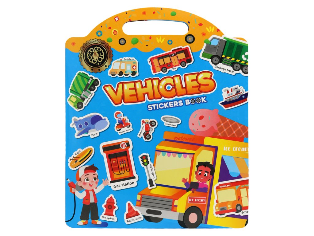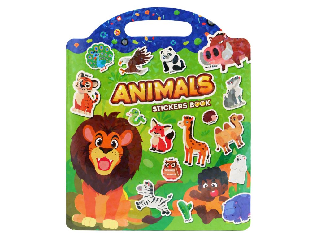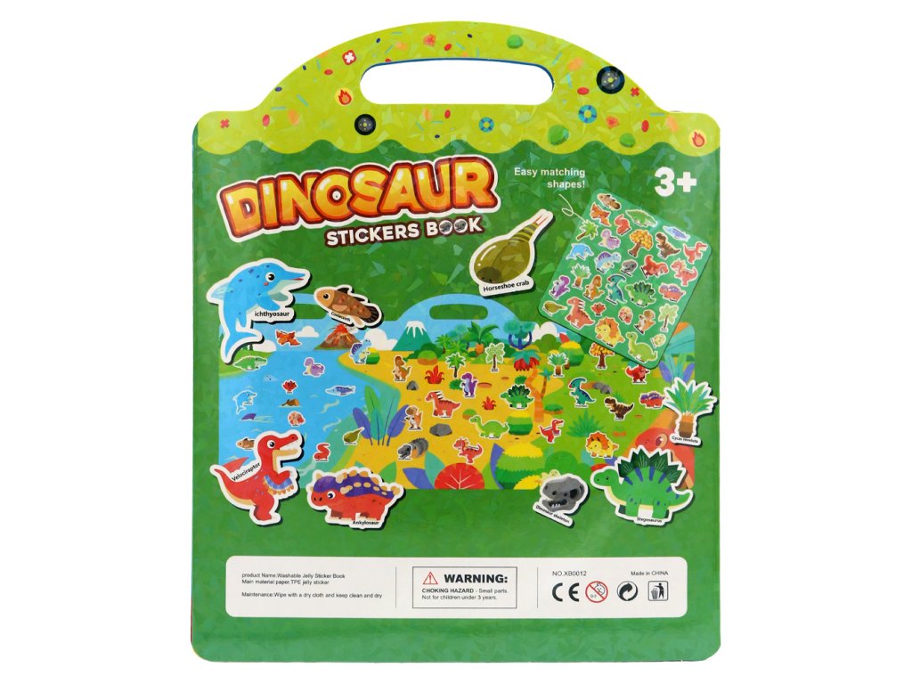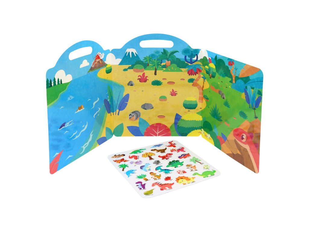 Otevřete 3 dílnou knihu s velkým panoramatickým obrázkem uvnitř a umístěte gelové nálepky postaviček/zvířátek na místo, které je pro ně nejpřirozenější (mix 6 motivů).