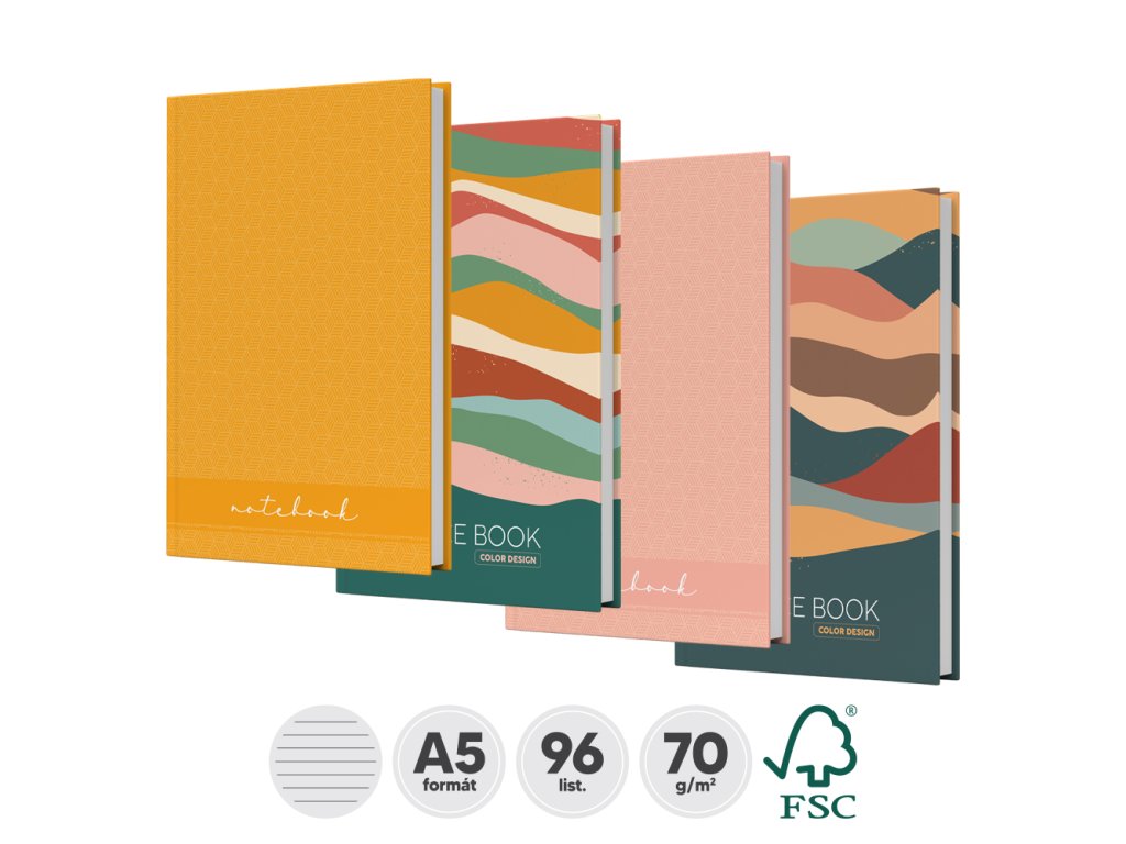 Záznamové knihy A5 sú vyrobené z bezdrevného písacieho papiera. Obálka je vyrobená z tvrdého kartóna, ktorý je potlačený rôznymi farebnými motívmi a potiahnutý laminom. (8 dizajnov). Linajková - 96 listová. Na palete sa nachádza 2520 ks.Doplňkové parametry