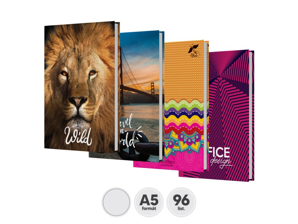 Záznamové knihy jsou vyrobené z bezdřevného psacího papíru. Obálka je vyrobená z tvrdého kartónu, který je potištěný různými barevnými motivmi a potažený laminem.Doplňkové parametry