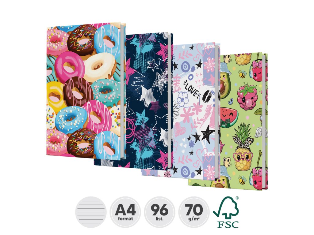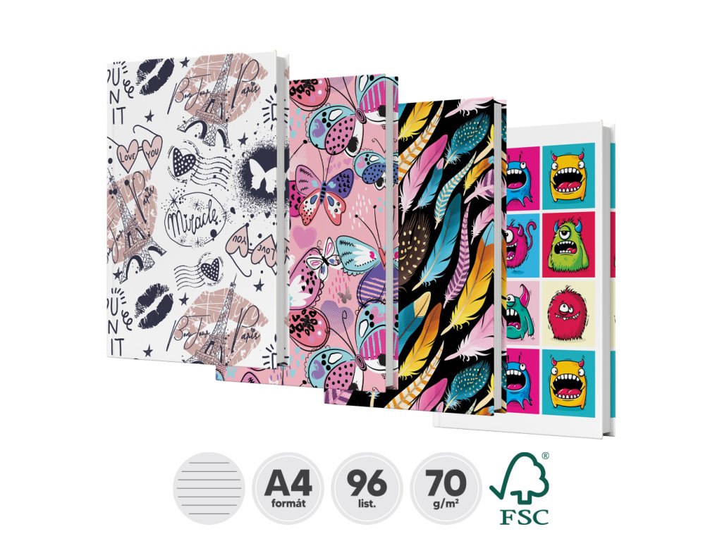 Záznamové knihy jsou vyrobené z bezdřevného psacího papíru. Obálka je vyrobená z tvrdého kartónu, který je potištěný různými barevnými motivmi a potažený laminem.Doplňkové parametry