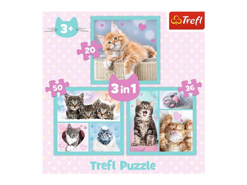 Dětské puzzle Trefl s oblíbeným motivem koťátek, tři skládačky v jednom balení. Sada obsahuje tři obrázky roztomilých koťátek s různými úrovněmi obtížnosti - 20, 36 a 50 prvků. Díky různým úrovním obtížnosti je hra jako stvořená pro mladší i o něco starší děti. Výrobce použil ekologické materiály a papír, který snižuje odraz světla a zajišťuje bezpečnost při hraní. Plnění hlavolamů rozvíjí vnímavost, logické myšlení, vytrvalost při dosahování cíle a trpělivost. Roztomilá zvířátka jsou skvělou zábavou pro celou rodinu!Skládání puzzle je oblíbená zábava. Puzzle můžete složit, znovu rozebrat a později si to zopakovat nebo obrázek třeba slepit a použít jako dekoraci na stěnu. Puzzle TREFL je kvalitní polskou značkou, která od roku 1985 získala jedno z předních míst na trhu s puzzle. Rozměry složeného obrázku tříkrát 20 x 19,5 cm, balení krabička, rozměry balení cca 29 x 29 x 6 cm. Puzzle je vhodné pro děti od 3 let.