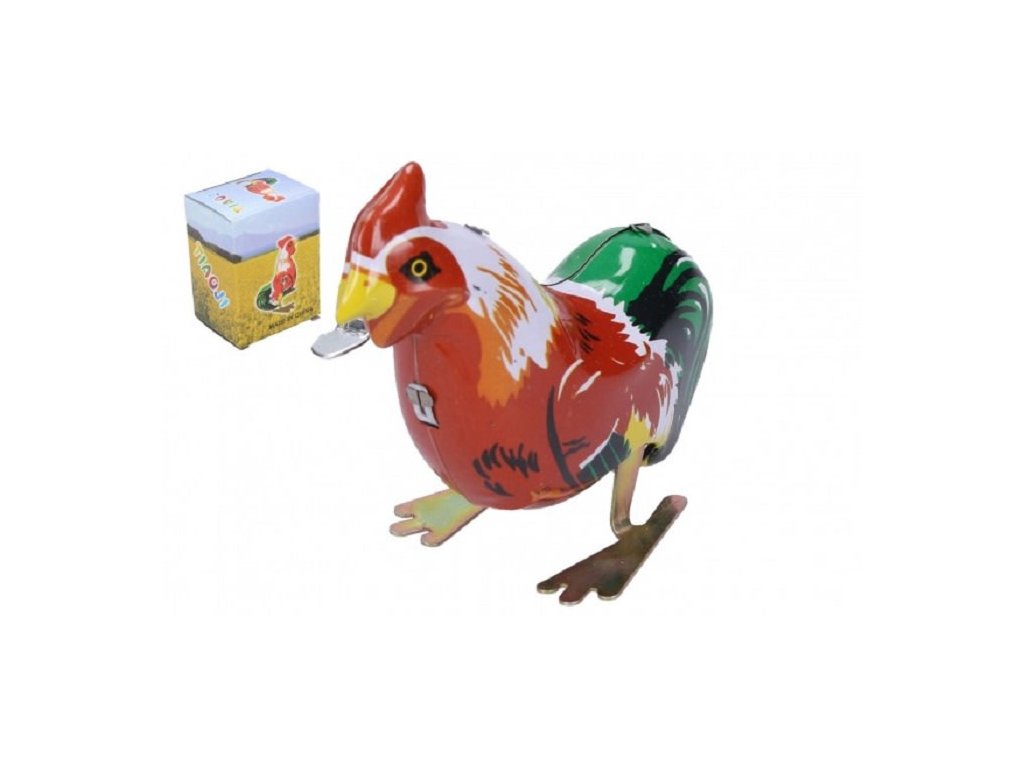 Pohyb plechového kohoutka zajišťuje pérový strojek natahovaný klíčkem. Rozměry balení 6 x 9 x 5 cm. Vhodné pro děti od 3 let.Doplňkové parametry