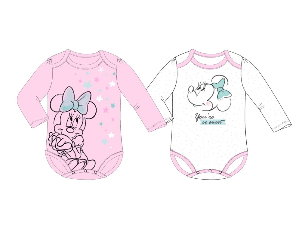 Kojenecké body pro nejmenší Minnie Mouse s dlouhým rukávem, barevné provedení bílé, příjmený materiál: 100% bavlna, 180 gsm.