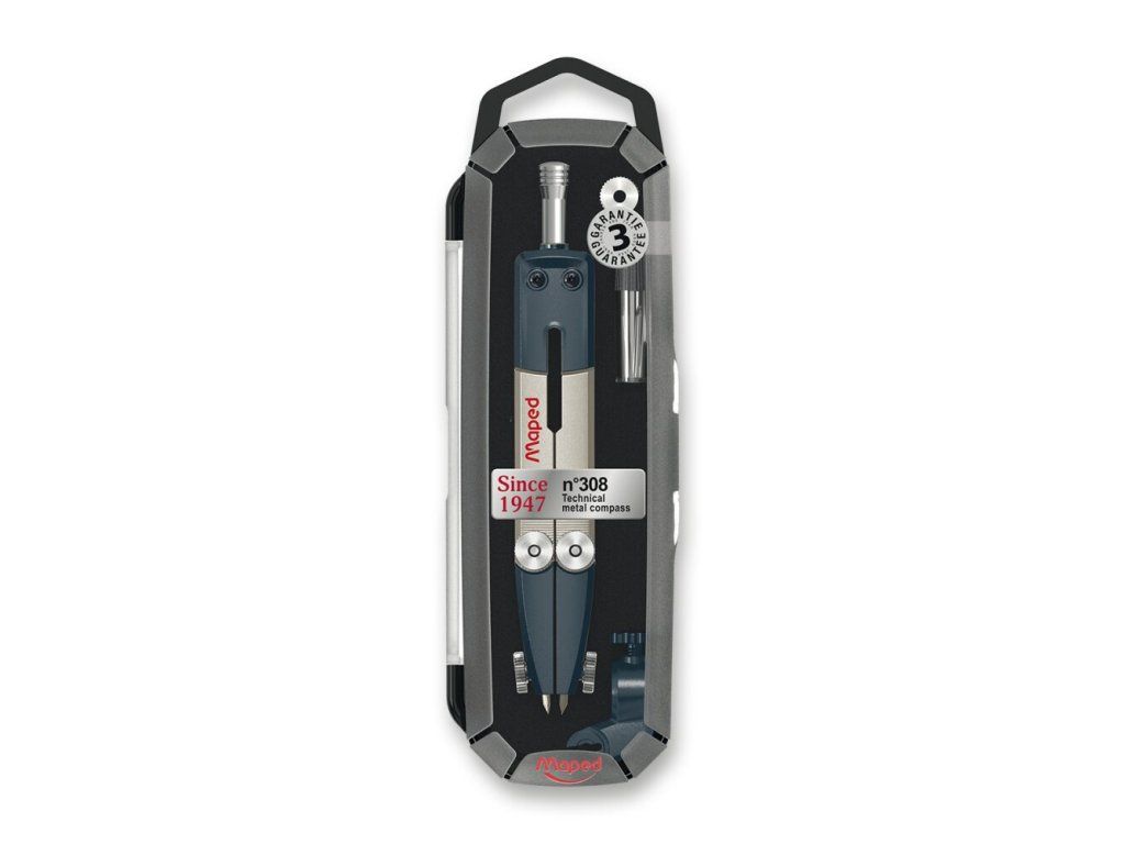 Kružítko Maped N°308 Technical Metal Compass je kvalitní kružítko pro kružnice do průměru 300 mm. Ergonomické tělo pro snadné a pohodlné použití. Jehla je odolná proti proklouznutí. Kvalitní tuha s pevným upevněním pro precizní práce. Souprava obsahuje kružítko, náhradní tuhy a náhradní jehlu.Doplňkové parametry