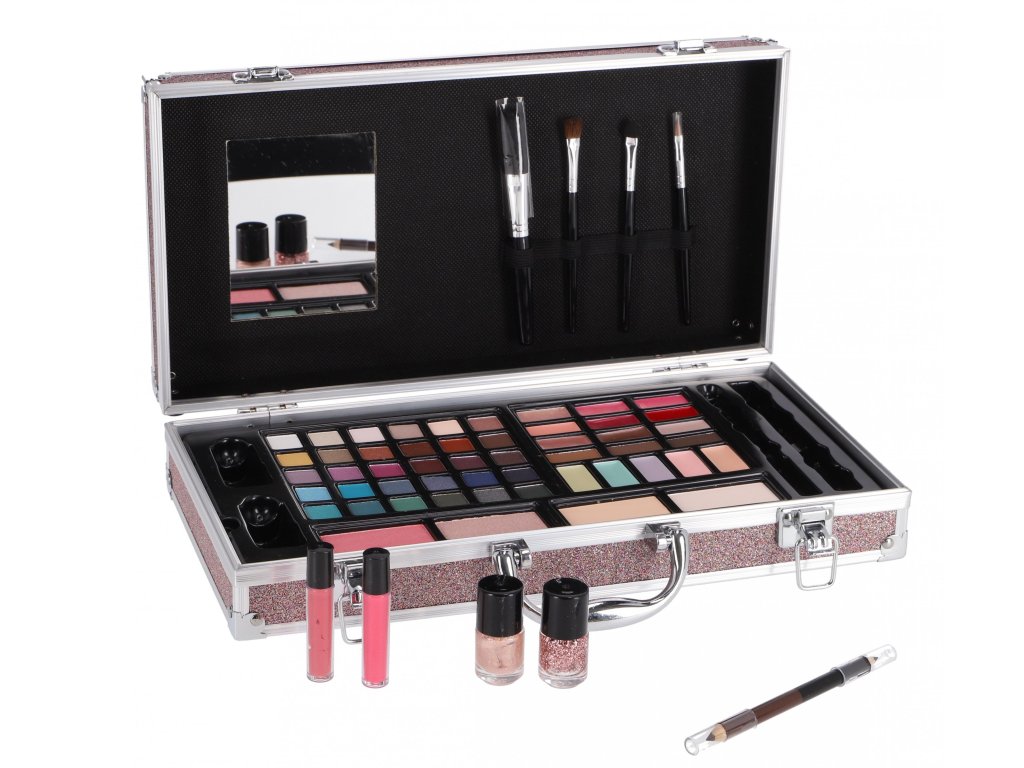 Luxusní Kosmetický kufřík Tohle není jen kosmetika, tohle je profesionální výbava, ve které je každý detail dotažen k dokonalosti. Kufřík: Design a funkčnost na maximum Zvenčí ultra elegantní, metalický růžový design s leštěnými detaily, který vypadá jako VIP zavazadlo. Zaručeně upoutá pozornost a budí dojem opravdového luxusu. Pevný, odolný materiál a precizní uzavírání zajistí, že líčidla jsou v prvotřídním bezpečí. Žádné rozsypané stíny ani zlomené rtěnky. Chytré rozložení, které ti umožní mít dokonalý přehled. Je to tvůj osobní make-up ateliér v miniatuře. Líčidla: Kvalita, barvy a lesk Sada je sestavena z líčidel, která jsou kvalitou a pigmentací na špičce, takže se s nimi skvěle pracuje a look vydrží. Exkluzivní kufřík obsahuje: Oční stíny, tvářenky, rozjasňovače, štětečky, lesky na rty, tužka na oči, laky na nehty, zrcátko. Kosmetický kufřík se zrcátkem. Obsah: 2 lesky na rty, 2 tvářenky, 2 pudry, 1 dvojitá tužka (2 barvy), 30 barev očních stínů, 3 krémové oční stíny, 3 barvy na obočí, 6 lesků na rty, 2 laky na nehty, 5 korektorových barev a 4 různé štětce.Doplňkové parametry