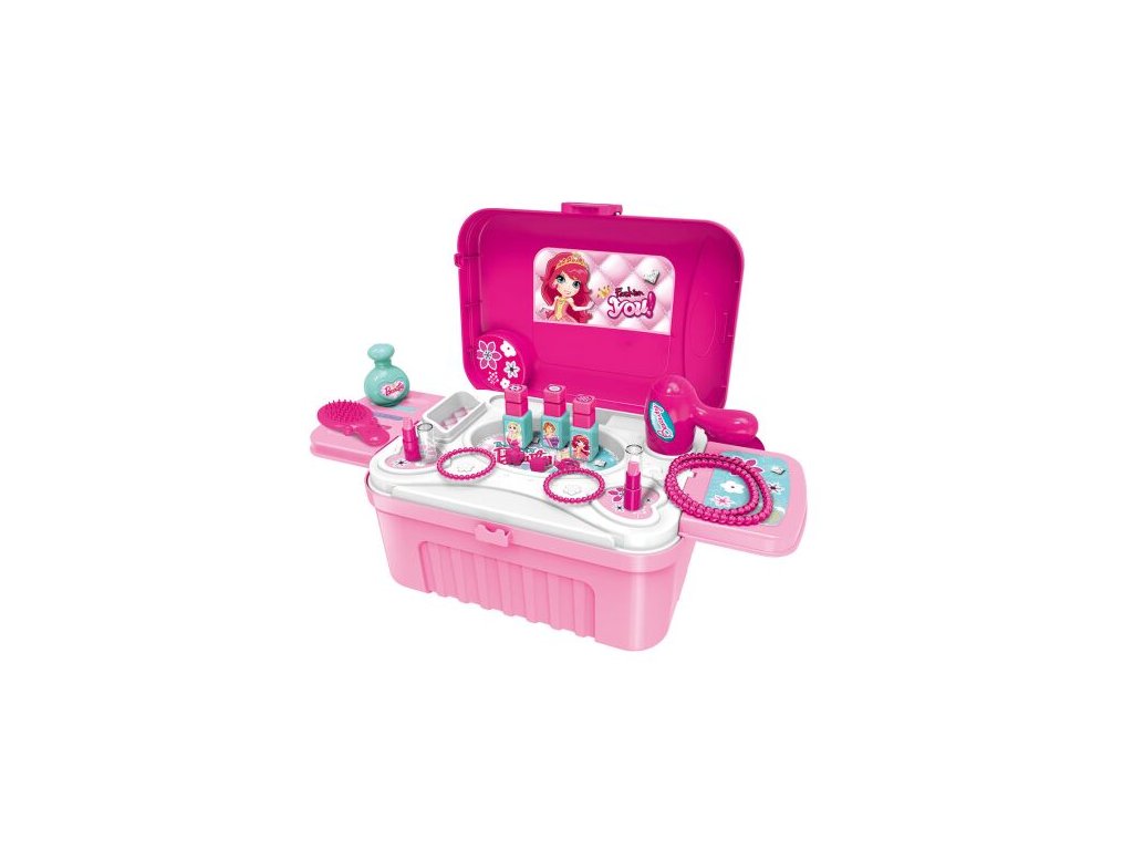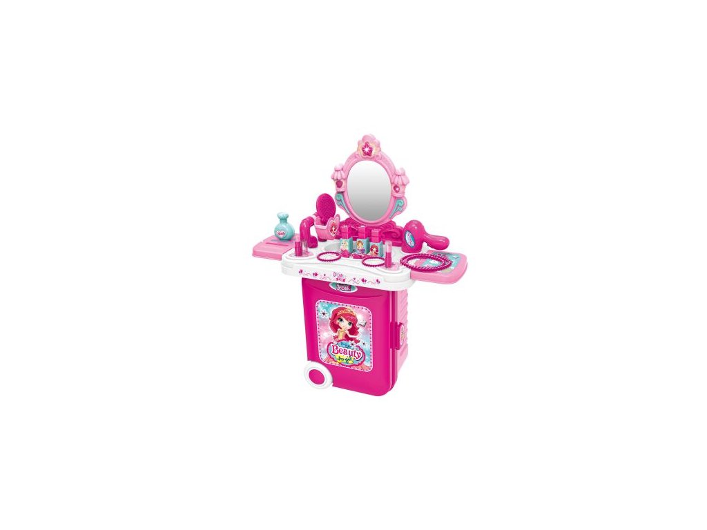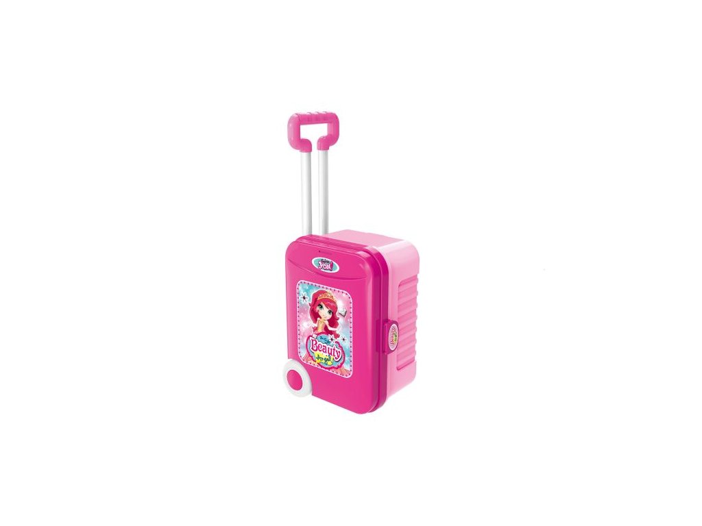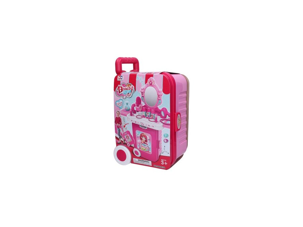 Kosmetický stolek kufřík. Velikost 38cm. Kufřík je na kolečkách a má vysunovací madlo. Výška s vysunutým madlem 55,5cm, výška se zasunutým madlem 38cm. Kufřík jde přestavět na kosmetický stolek o rozměrech: 60x50x21cm. Návod na sestavení na obale. Obsahuje fén, kartáč na vlasy, náramky a další příslušenství. Baterie 3xAAA nejsou součástí. Zezadu zrcadla je vypínač na jeho rozsvícení. Světelné a zvukové efekty.Doplňkové parametry