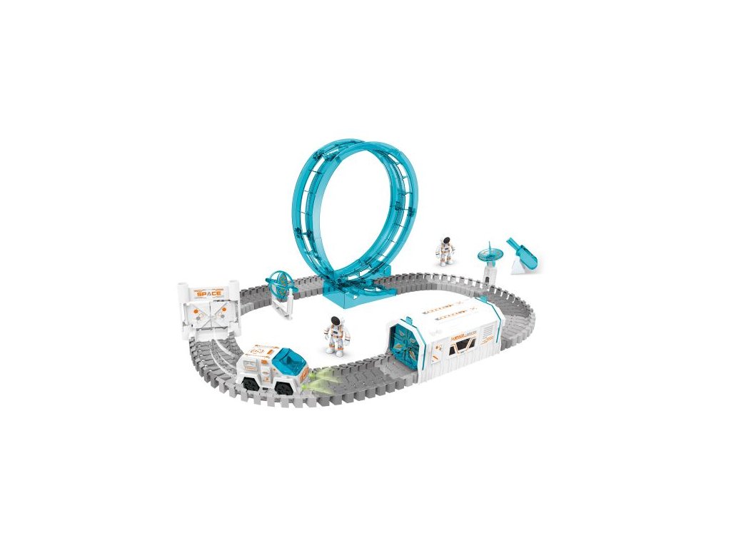 Kosmická dráha malá. Rozměry 65x50x32 cm. Součástí auto, kosmonaut, funkční projektor. Světelné efekty. 2xAAA baterie do auta nejsou součástí, 3xAG13 do projektoru součástí. Přepínač ON/OFF na spodní straně auta a na projektoru. Obrázkový návod na sestavení na obalu. Dráhu lze sestavit do různých tvarů dle obrázků na obalu.Doplňkové parametry