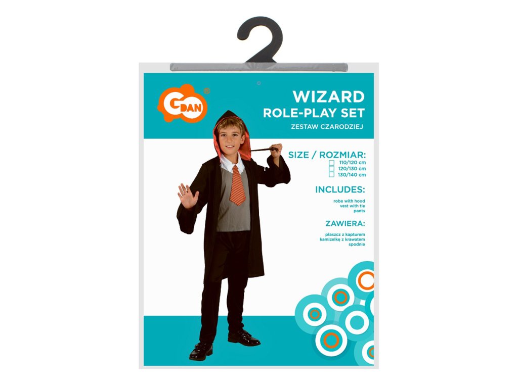 Souprava obsahuje: plášť s kapucí, vesta s kravatou a kalhoty