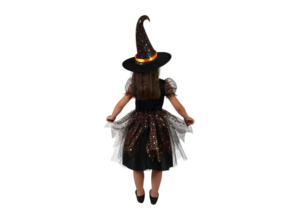 Roztomilý čarodějnický kostým o velikosti M je určen pro holčičky ve věkovém rozmezí 6-8 let (116-128 cm). Černé šaty s nadýchanou sukní jsou zdobeny oranžovými prvky a saténovou stuhou v přední části. Součástí balení je samozřejmě perfektně sladěný klobouk, který dodá kostýmu tu správnou atmosféru! S tímto úchvatným kostýmem se zaručeně staneš hvězdou karnevalu i Halloweenu!Doplňkové parametry