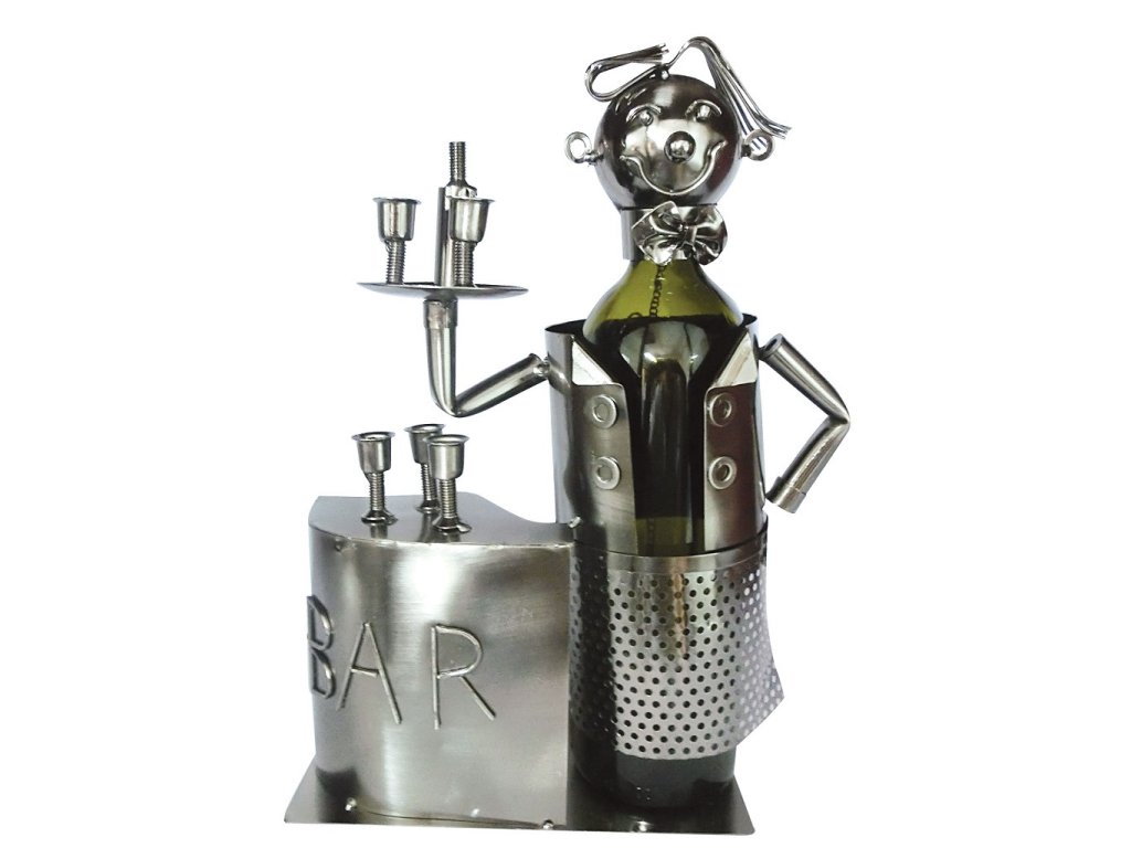 Popis produktu Stojan na jednu láhev vína . Doporučujeme jako tématický dárek.Láhve dobrého vína by se neměly po bytě toulat jen tak, zaslouží si něco lepšího. Co takhle originální stojan, ve kterém by působily trendy a zajisté by překvapily všechny hosty? Obdarujte oslavence tímto originálním stojanem. Vhodný pro typ klasické láhve 0,75 l. Nejedná se o výrobek z dílny uměleckého kováře, ale o strojově vyráběné produkty u kterých se mohou vyskytnout drobné mechanické poškození v rámci strojové výroby. Vyrobeno z kovuPrůměr otvoru na láhev: cca 9 cmDoplňkové parametry