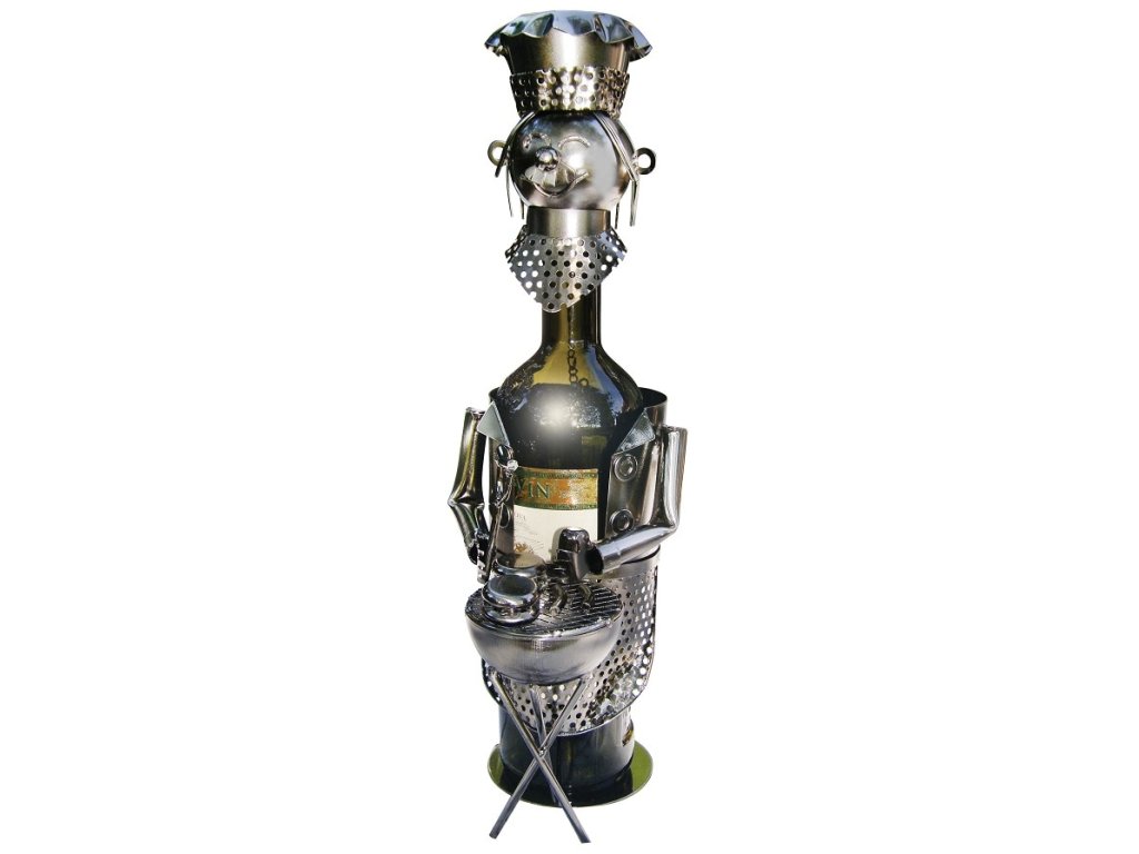 Kovový stojan na víno, motiv kuchař s grilem