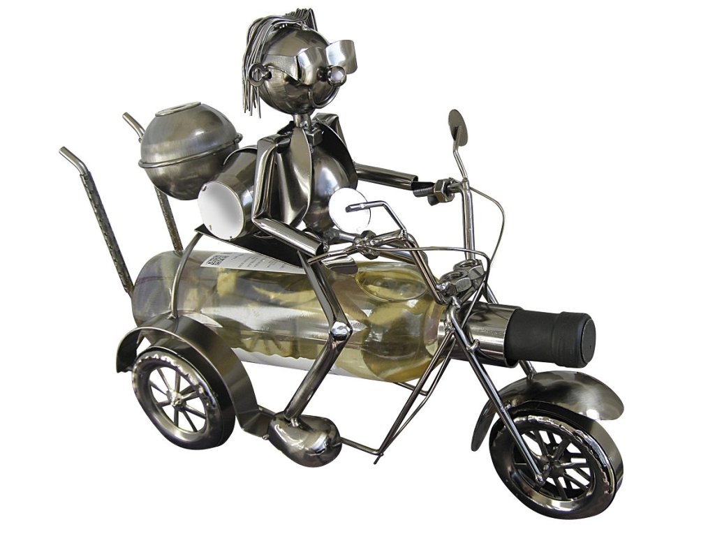 Kovový stojan na víno, motiv motorkář na tříkolce