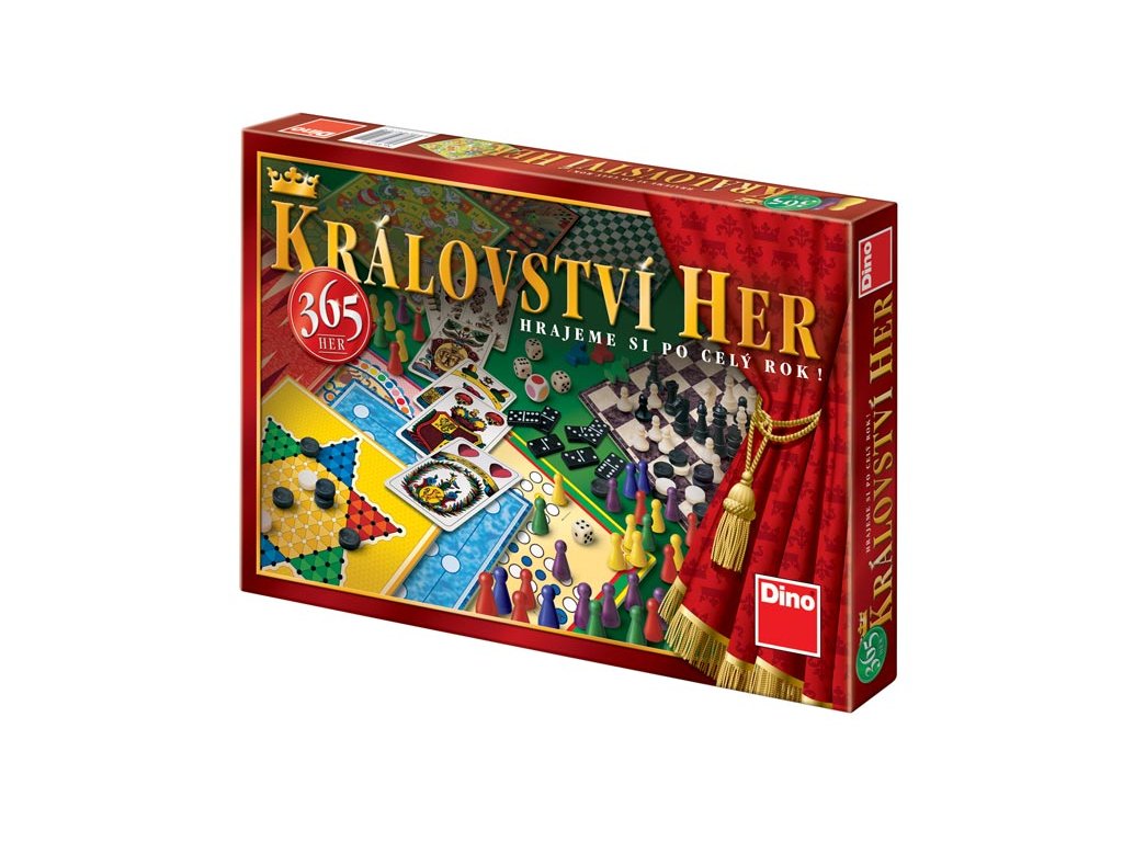Království her (365 her). Balení obsahuje 6 oboustranných herních plánů, 32 šachových figurek ve 2 barvách, 75 plastových figurek v 6 barvách, 30 dámových kamenů ve 2 barvách, 28 plastových kamenů domina, 4 dřevěné figurky husiček, 32 mariášových karet, 6 bodových hracích kostek, 1 hrací kostku s barvami, 1 pravidla.Doplňkové parametry