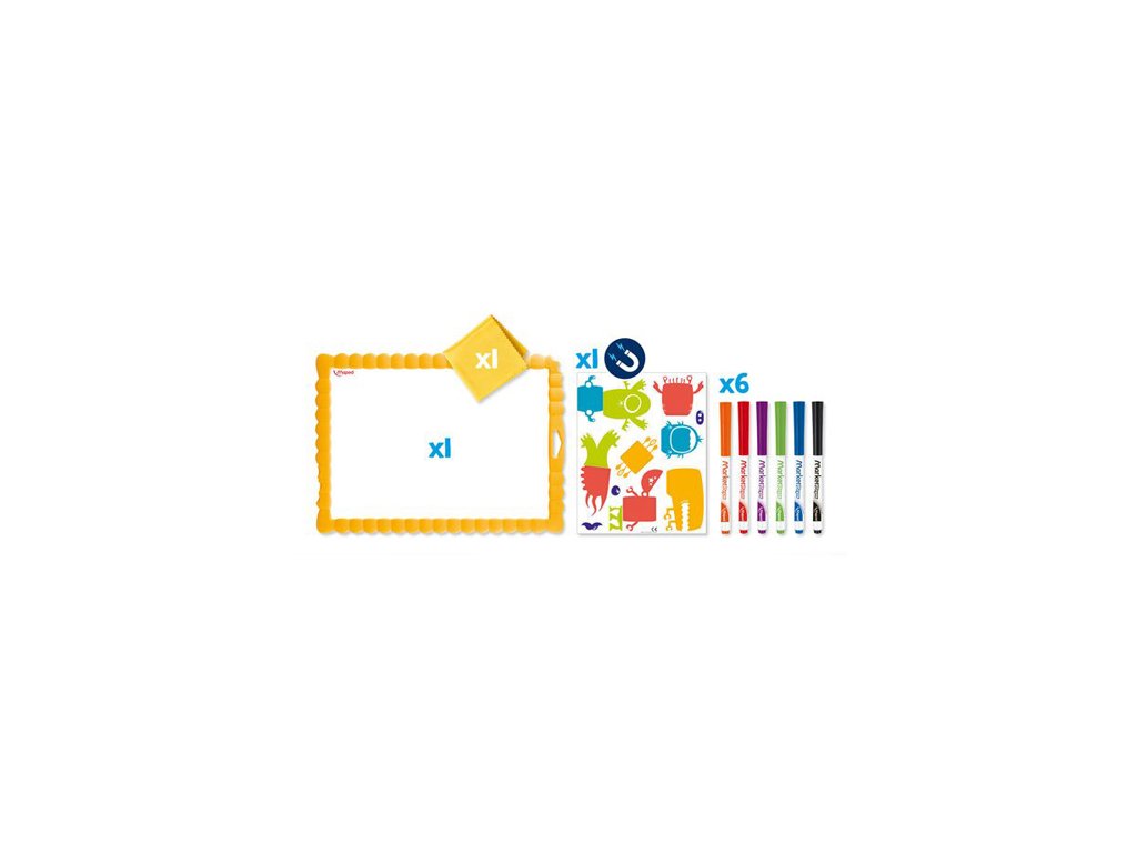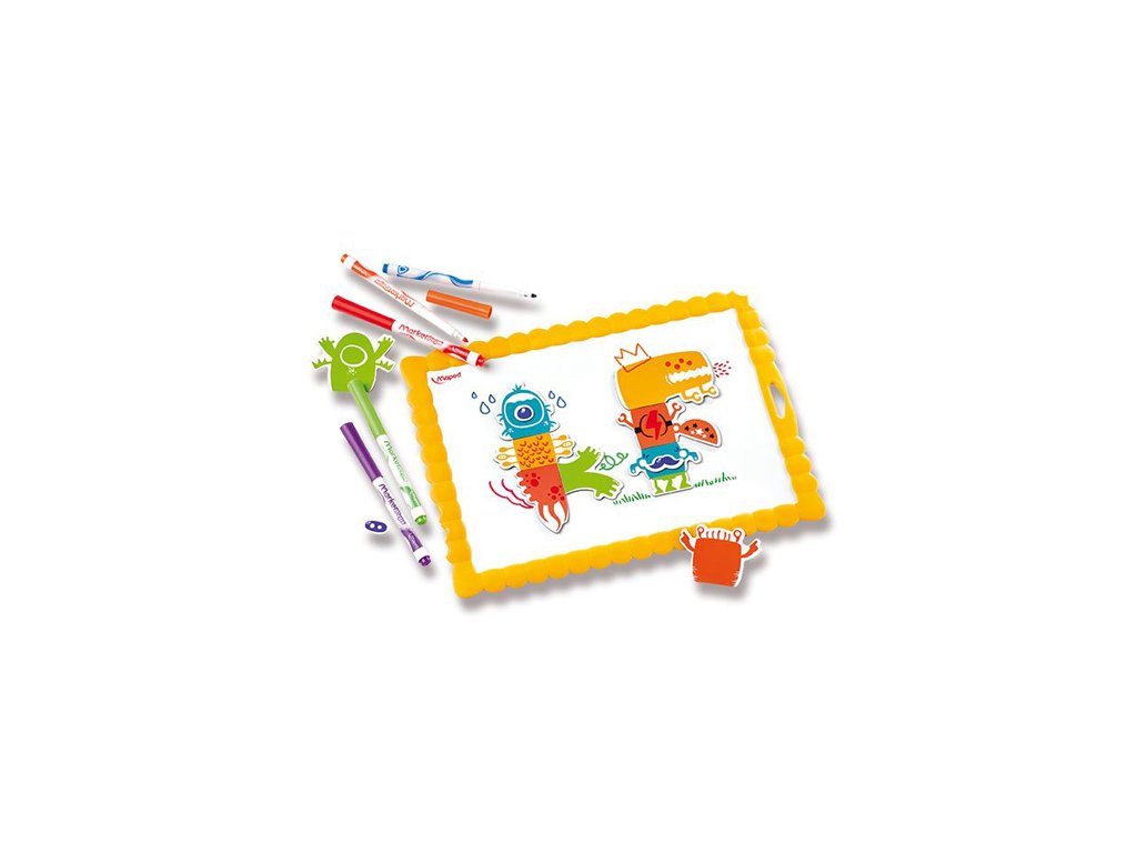 Souprava obsahuje: magnetickou tabulku 6 fixy na bílé tabule Marker'Peps – oranžovou, červenou, fialovou, zelenou, modrou a černou hadřík na stírání fixů arch s magnety – různými částmi příšerek Postup: vybrat si magnety a poskládat z nich příšerku podle vlastní fantazie dotvořit příšerku pomocí stíratelných fixů, kreslit můžete i na magnety setřít fixy, složit magnety a začít znovu Vhodné pro děti od 4 let.Doplňkové parametry