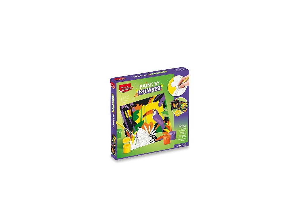 Kreativní sada Maped Creativ Paint by number s motivy tukana a motýla k vytváření krásných obrázků pomocí techniky malování podle čísel. Sada obsahuje 2 číslované šablony k vybarvení, 12 lahviček s akrylovými barvami, štětec a rámeček pro vystavení obrázku. 2 šablony (20 x 20 cm)12 lahviček s akrylovými barvamištětecrámeček Vhodné pro děti od 7 let.Doplňkové parametry