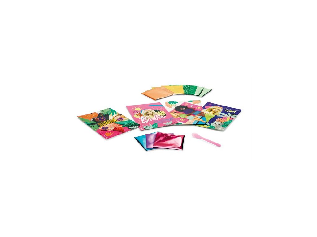 Karty s motivy panenky Barbie s plochou pro aplikaci metalické fólie a vytvoření originálního obrázku.