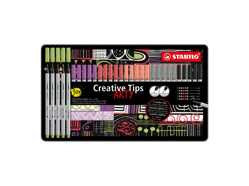 So STABILO Creative Tips je možné pracovať rôznymi technikami a kombinovať ich vďaka rôznym šírkam stôp a hrotom.