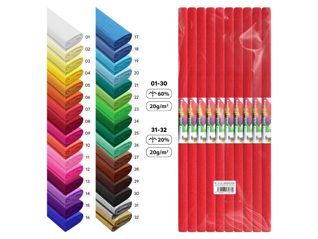 Krepový papír s jemnou strukturou vhodný pro tvůrčí školní práce, dekorační a aranžérské účely.