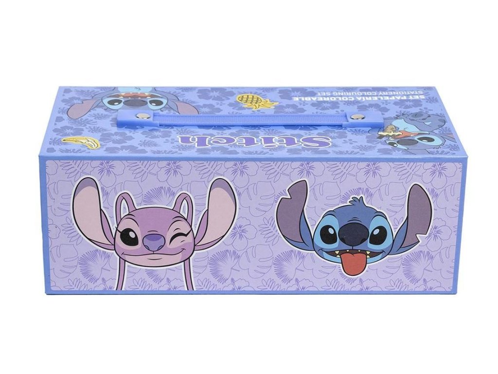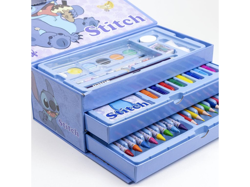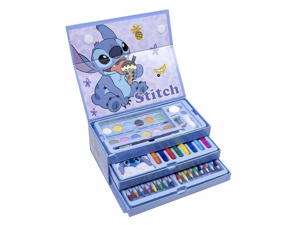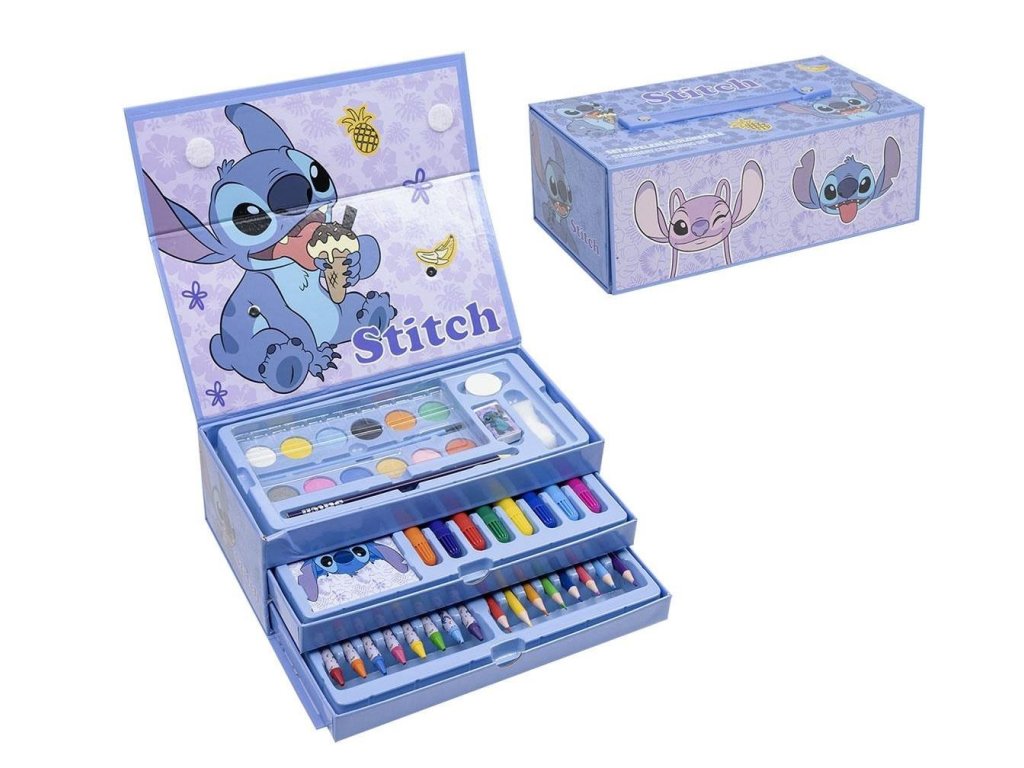 Kreslící souprava Stitch v praktickém kufříku. Obsahuje: celkem 42 ks dle vyobrazení - fixky, crayony, barvičky, notýsek, pastelky, tužku, gumu, ořezávátko, štětec, houbičku a jiné. Rozměry balení: 26 x 14 x 9 cm. Oficiální licence, Cerda.Doplňkové parametry