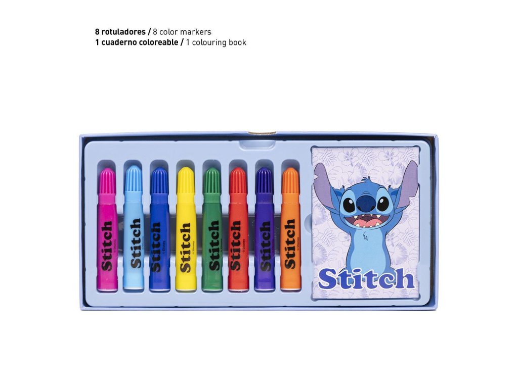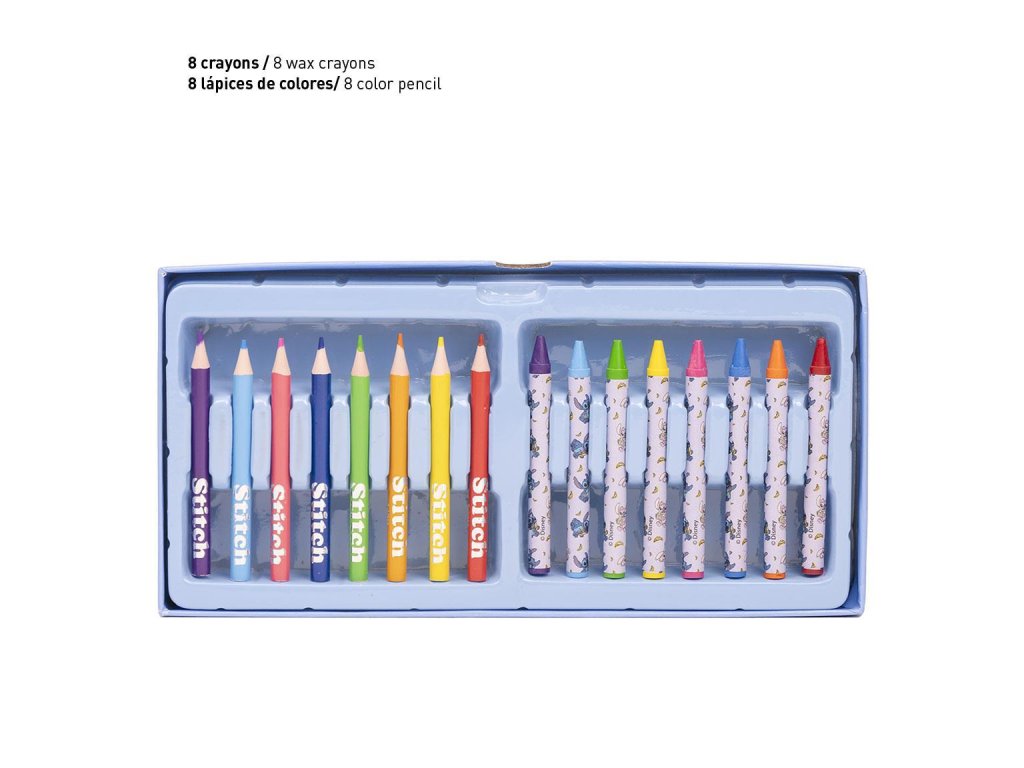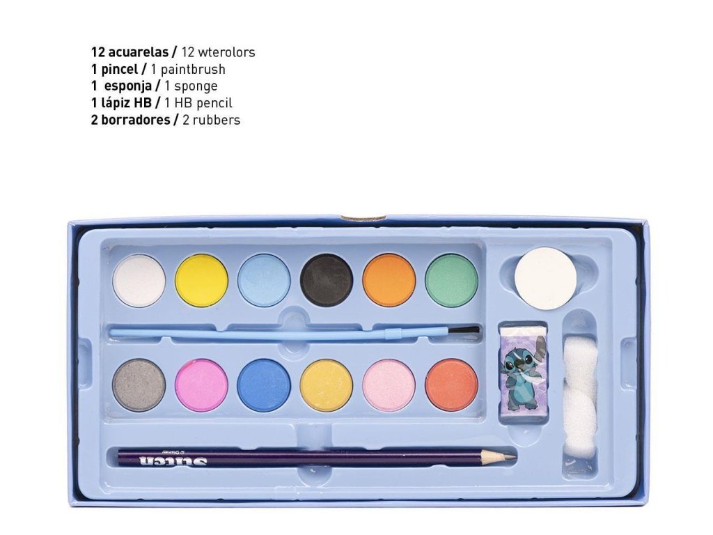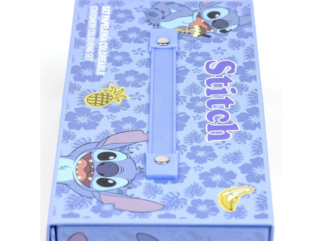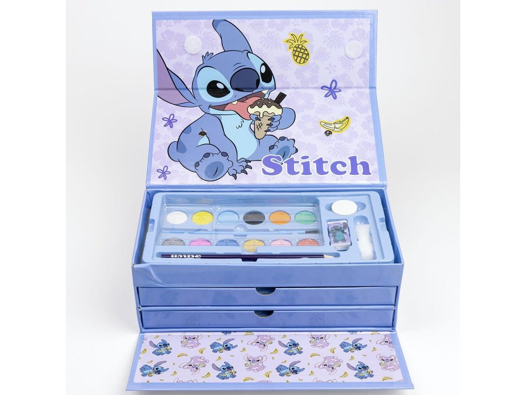 Kreslící souprava Stitch v praktickém kufříku. Obsahuje: celkem 42 ks dle vyobrazení - fixky, crayony, barvičky, notýsek, pastelky, tužku, gumu, ořezávátko, štětec, houbičku a jiné. Rozměry balení: 26 x 14 x 9 cm. Oficiální licence, Cerda.Doplňkové parametry