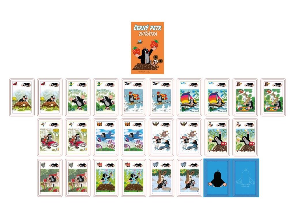 Černý Petr Krteček - zvířátkaDětská karetní hra Černý Petr je doporučena dětem již od 3 let. U hry není potřeba umět číst či počítat.Vyhrává vždy ten, kdo vyloží na stůl všechny stejné dvojice z rukou. Naopak prohrává ten, komu v ruce zůstane karta Černého Petra. Doba hry:min. 15 minut Počet hráčů:2 - 4 Motiv karet:KrtečekDoplňkové parametry
