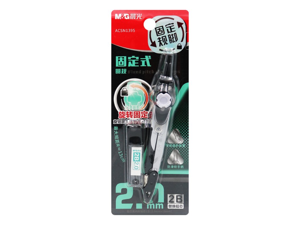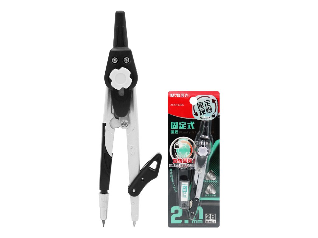 Kružítko od značky M&G s kovovým tělem. Úchop je z plastového materiálu. Ke kružidlu jsou také náhradní náplně 2,0 mm, s tvrdostí 2B.Doplňkové parametry