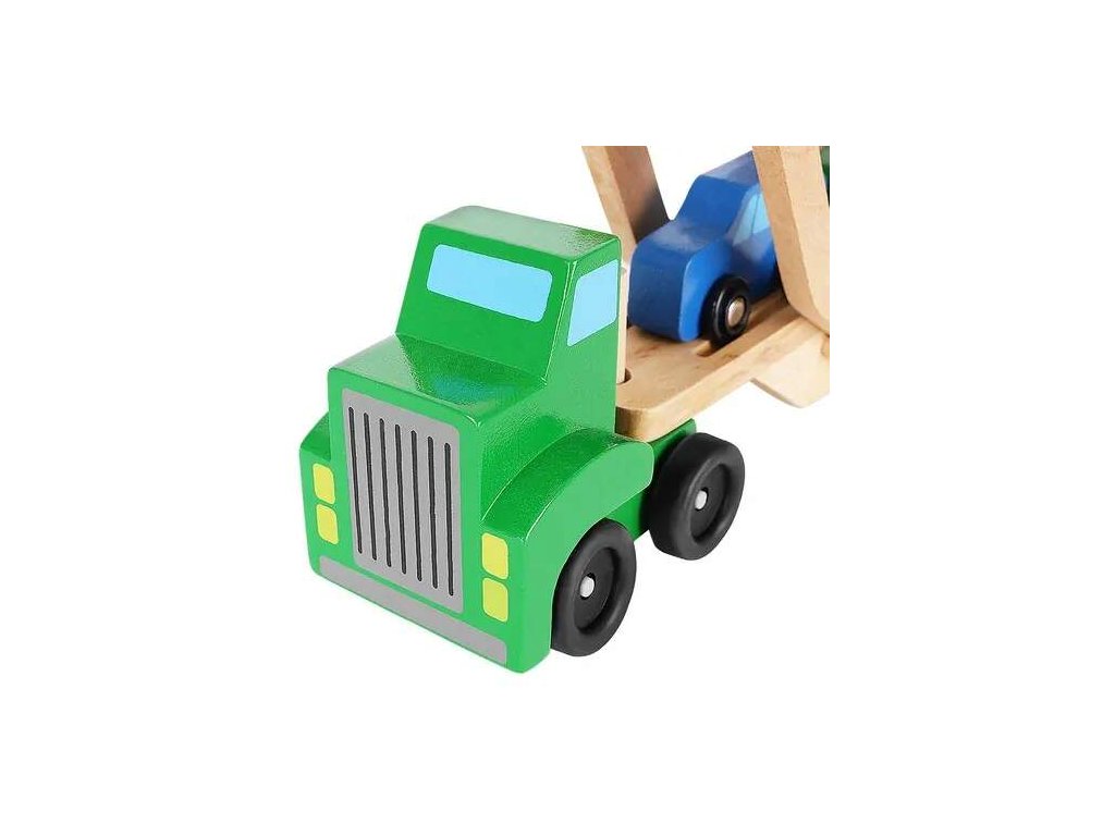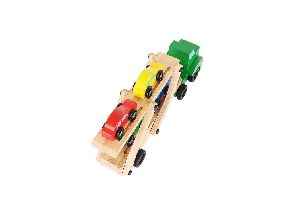 Dřevěný náklaďák s přívěsem a auty je hračka, která osloví každého malého automobilového nadšence. Vaše dítě se díky ní může vydat do světa plného aut a kamionů a strávit tam dlouhé hodiny radostné zábavy. Odtahovka je vozidlo, které rozhodně nemůže chybět v žádné sbírce aut. Díky němu může vaše dítě libovolně přepravovat vozidla z místnosti do místnosti a cítit se jako skutečný řidič kamionu. Otočná kola a odnímatelný skládací přívěs učiní zábavu realističtější. Sada je vyrobena ze dřeva a natřena zdravotně nezávadnou barvou. Hračka má aerodynamické tvary, díky kterým si dítě neublíží ani bez dozoru dospělého.Dřevěné hračky jsou pevné a odolné proti poškození. V neporušeném stavu mohou sloužit po generace, což se o jejich plastových protějšcích říci nedá. Hračka bude vhodná pro chlapce i dívky. Krásné, živé barvy přitahují pozornost dětí, podněcují jejich fantazii a podporují zábavu. Velmi promyšleným způsobem rozvíjí manuální dovednosti dětí, pomáhá jim procvičovat motorickou koordinaci a rozvíjí schopnost logického myšlení.