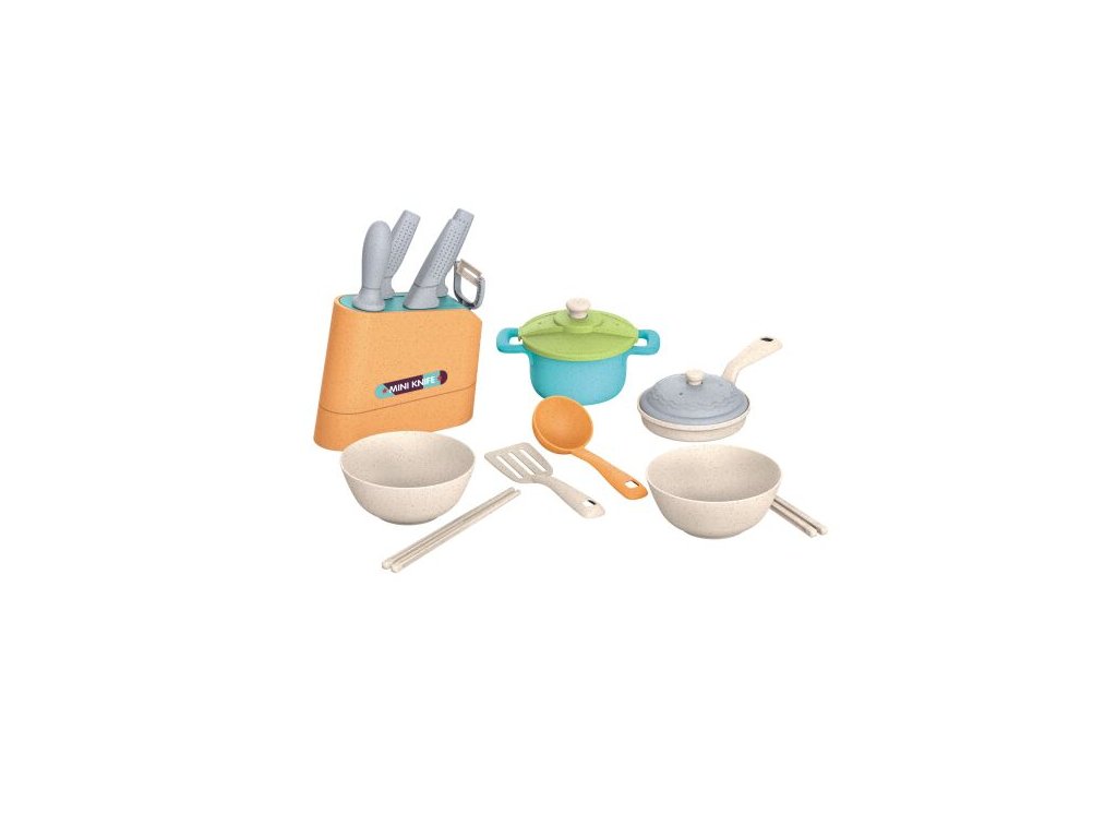 Kuchyňské nádobí Organic. Hrnec s poklicí, pánvička s poklicí, 2 misky, 3 nože, zásobník na nože, brousítko nožů, škrabka, 2 naběračky, 2 hůlky.Doplňkové parametry