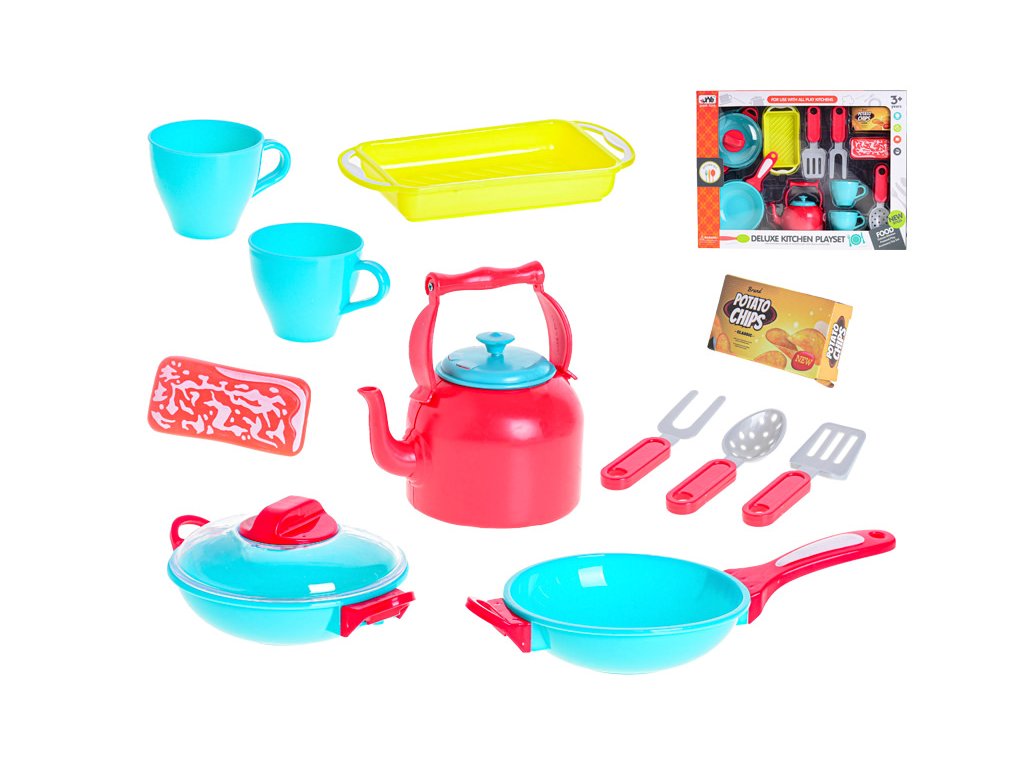 Každá malá kuchařinka chce mít vlastní nádobíčko, aby mohla svým panenkám připravit výborné jídlo. Tyto hračky zaručeně způsobí hodně radosti, vaše dcerka se bude cítit dospěle a důležitě. Rozměry balení (š v h): 41 x 31 x 9cmRozměry pánvice (d): 20cmMateriál: plast Obsah balení: konvice s víčkem, pánev, hrnec s poklicí, pekáč, hrníček 2ks, kuchyňské náčiní 3ks, makety potravin 2ks. Hračka je vhodná pro děti od 3 let.Doplňkové parametry