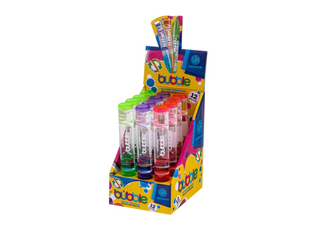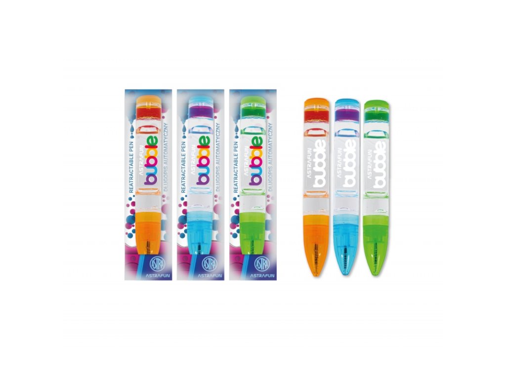 Kuličkové pero AstraPen BUBBLE přináší do psaní zábavu a kreativitu. Transparentní tělo s barevnými bublinkami vytváří při pohybu fascinující efekt, který zaujme děti i dospělé. Praktický modrý inkoust zaručí každodenní využití ve škole, práci i doma.