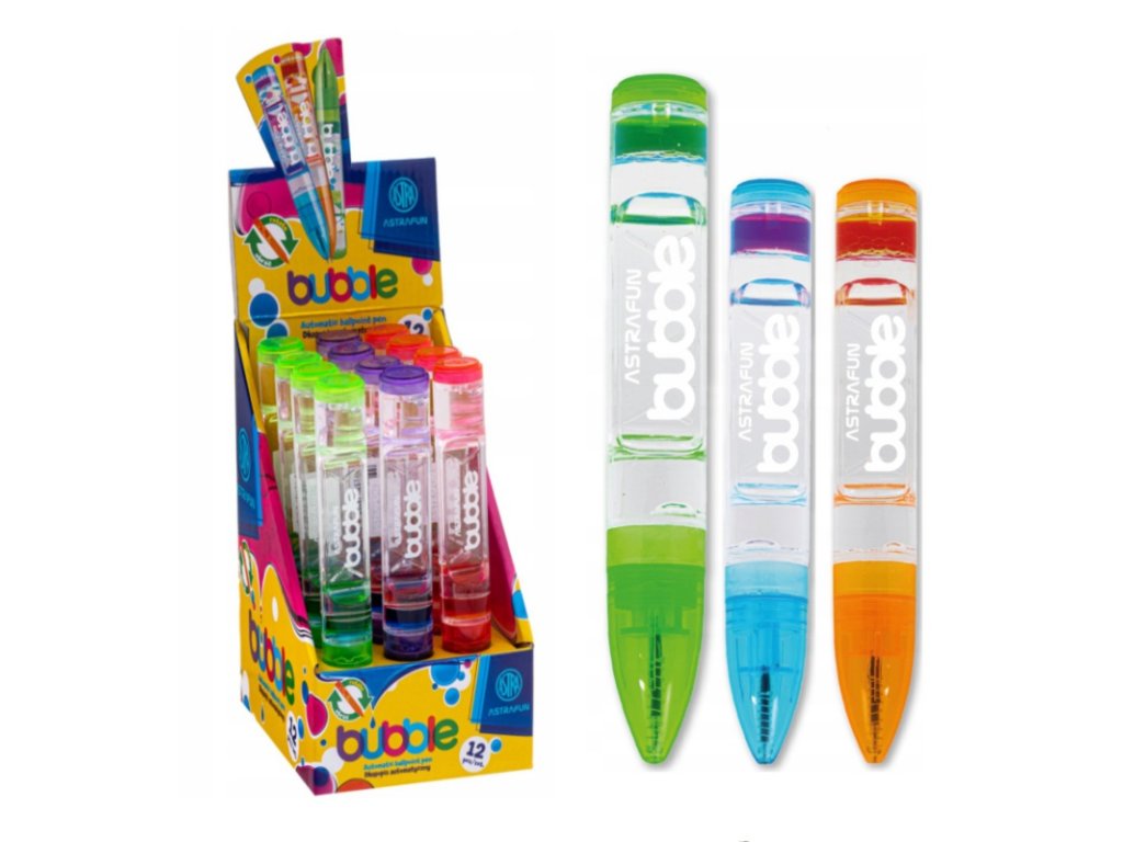 Zažijte psaní úplně jinak s kuličkovým perem AstraPen BUBBLE 🖊️✨. Tento originální psací nástroj spojuje praktičnost s hravou vizuální atrakcí – průhledné tělo pera obsahuje barevné bublinky, které se při pohybu pojí a rozdělují do různých tvarů.