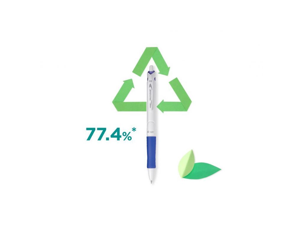 Kuličkové pero Acroball v ekologické verzi. Acroball Medium Begreen vybaven ergonomickým úchopem, který se dobře drží v ruce a karbidovým hrotem, který se nedá deformovat a neopotřebovává se. Zasouvací hrot: pero připravené jedním kliknutím, žádná další ztracená víčka. Vyměnitelná náplň, ekonomičtější a ohleduplnější k životnímu prostředí. Vyrobeno z 77,4%* recyklovaného plastu (mimo spotřební materiál) s cílem snížit náš dopad na životní prostředí. Spolehlivá a odolná kulatá špička z karbidu wolframu v kombinaci s pokročilým inkoustem na bázi oleje poskytuje jemný a plynulé psaní.Doplňkové parametry