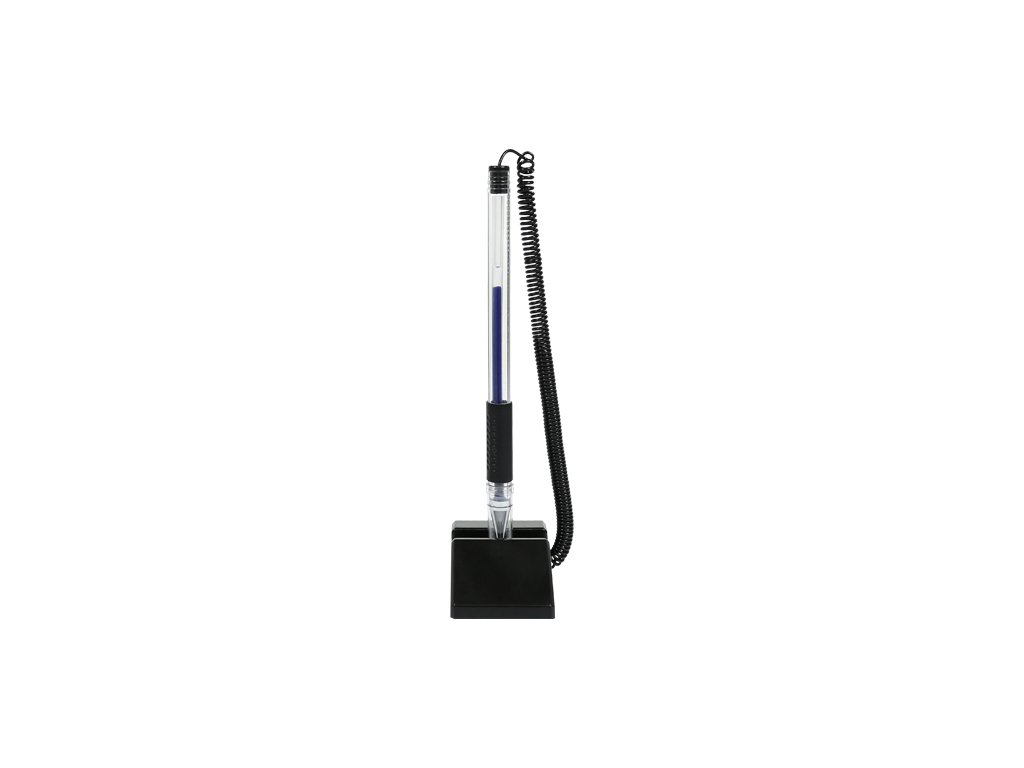 Kuličkové pero na pružince s praktickým plastovým stojánkem. Průměr hrotu 0,7mm. Ideální pro kanceláře a úřady. Stojánek vybavený oboustranou lep. páskou pro snadné přichycení na plochý povrch. Barva náplně modrá. Průsvitné tělo pera s černým úchytem, pruDoplňkové parametry
