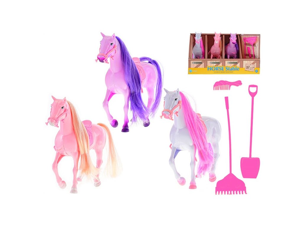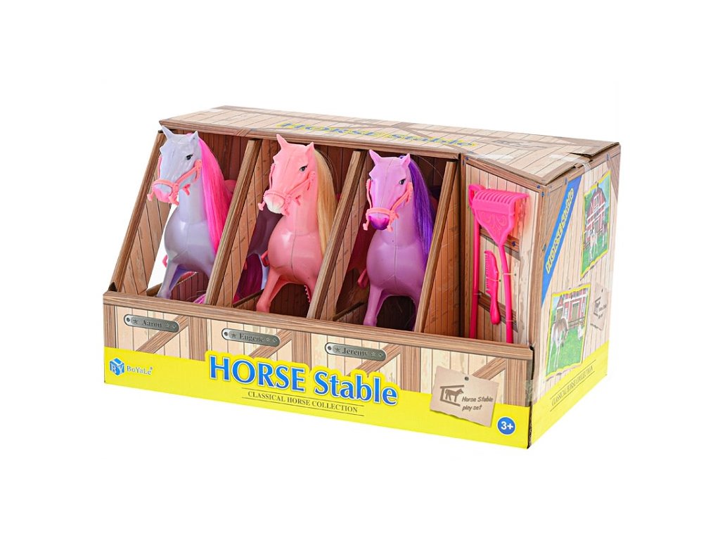 Tři krásní a osedlaní koníci 18 cm, kteří potěší každého milovníka koní. Každý kůň má jinou barvu a součástí balení jsou také doplňky, které k ošetřování musí mít každá správná stáj. Stáj je vyrobena z papíru. Materiál: papír, plast. Vhodné pro děti od tří let.Doplňkové parametry