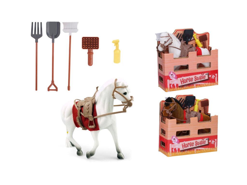 Kůň s doplňky. Rozměry 16x16x5 cm. Součástí kůň, vidle, lopata, smeták, kartáč, sprej. 2 varianty - bílý, hnědý. Doporučený věk: od 3 letDoplňkové parametry