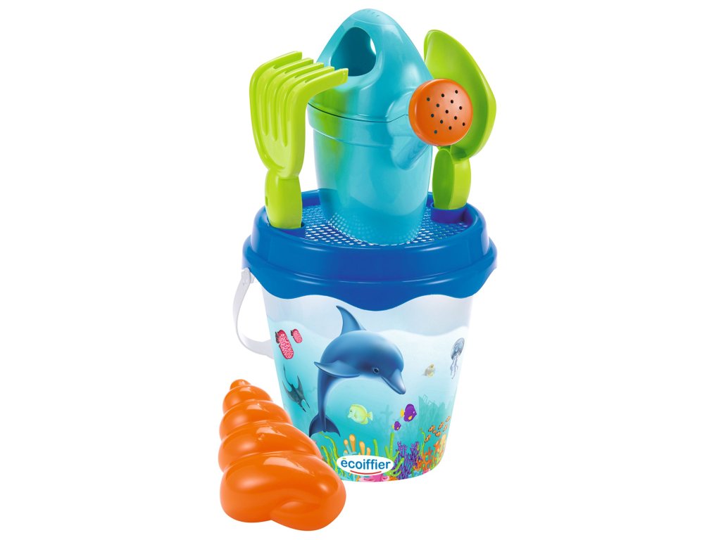 Set na písek s motivem delfína. Obsahuje kyblíček, sítko, hrabičky a lopatičku, konvičku a formičku. Průměr kyblíčku 17 cm, výška kyblíčku 18 cm.Doplňkové parametry