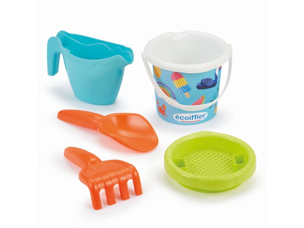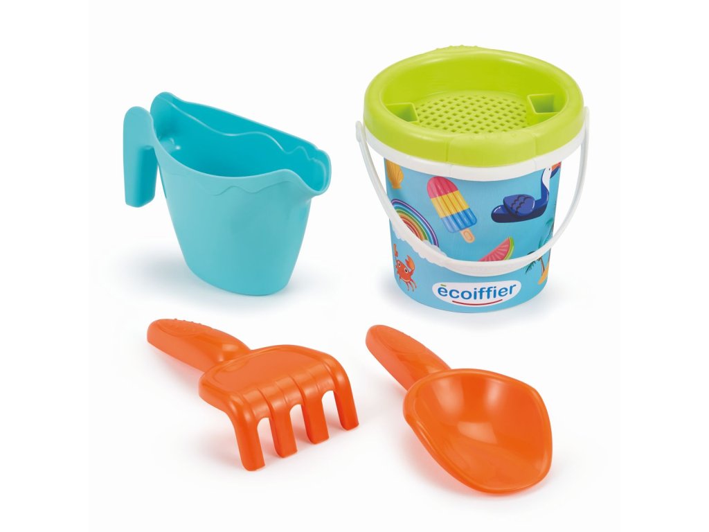 Kyblíček s prázdninovým motivem s konvičkou, sítkem, hrabičkami a lopatičkou. Průměr kyblíčku 12 cm, výška kyblíčku 15 cm.Doplňkové parametry